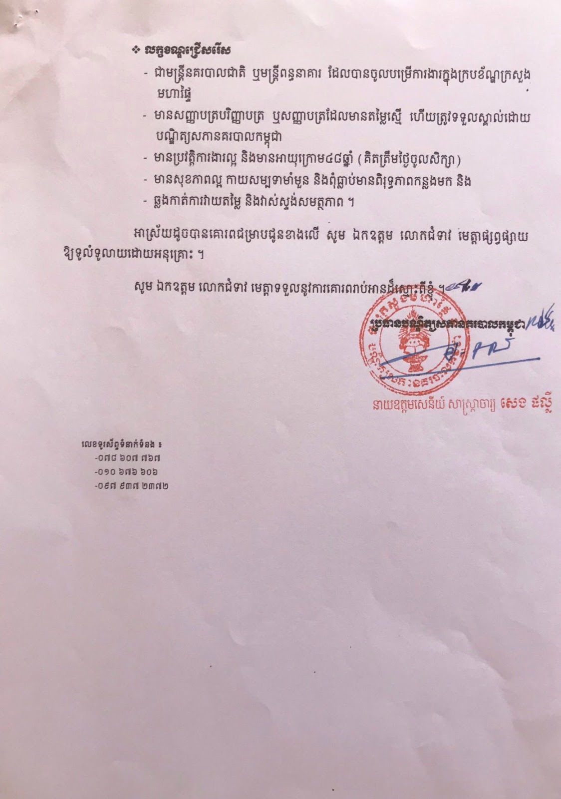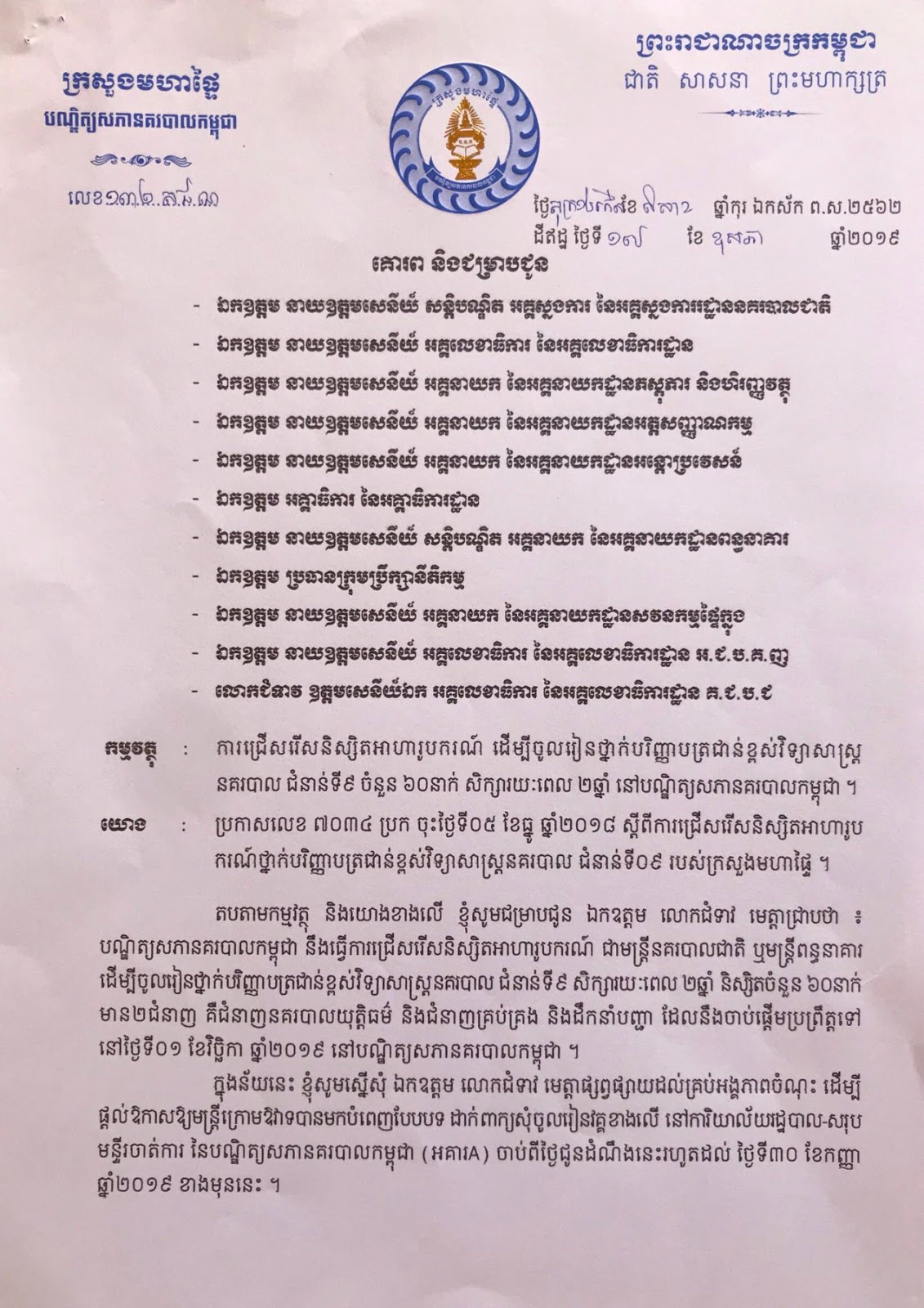 បណ្ឌិត្យសភានគរបាលកម្ពុជា ប្រកាសជ្រើសរើសនិស្សិតអាហារូបករណ៍ ដើម្បីចូលរៀនថ្នាក់បរិញ្ញាបត្រជាន់ខ្ពស់វិទ្យាសាស្ត្រនគរបាល ជំនាន់ទី៩ ចំនួន៦០ នាក់ សិក្សារយៈពេល២ឆ្នាំ នៅបណ្ឌិត្យសភានគរបាលកម្ពុជា។ សូមអានព័ត៌មានលំអិតខាងក្រោម៖