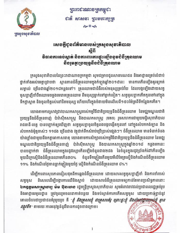 ភ្នំពេញ: ស្ថានភាពជំងឺគ្រុនឈាមក្នុងអំឡុងឆ្នាំ២០១៩ នេះ មានការកើនឡើងគួរឲ្យកត់សម្គាល់ច្រើនជាងឆ្នាំ២០១៨កន្លងទៅ ហើយជំងឺគ្រុនឈាម ជាជំងឺរបស់មនុស្សគ្រប់វ័យ ដែលបង្កឡើង ដោយសត្វមូលខ្លាញីខាំបឺតឈាមចម្លងមេរោគគ្រុនឈាន ពីមនុស្សម្នាក់ទៅមនុស្សម្នាក់ទៀត ដោយសត្វមូលខ្លាកកើតកូនចៅនៅក្នុងទឹកថ្លាស្អាត និងចូលចិត្តរស់នៅជិតមនុស្ស ហើយហើរក្នុងចំងាយមិនលើសពី១៥០ម៉ែត្រពីទីកន្លែតកកើតនោះទេ។