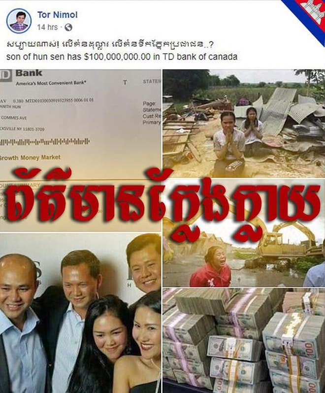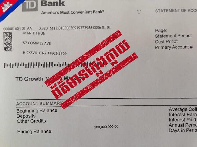 ឯកឧត្តម ហ៊ុន ម៉ានិត បានឲ្យដឹងដូច្នេះថា “ថ្មីៗនេះ ខ្ញុំបានឃើញព័ត៌មានក្លែងក្លាយពាក់ព័ន្ធនឹងគណនីធនាគារមួយ របស់អាមេរិកដែលប្រើទាំងឈ្មោះខ្ញុំ ទាំងឈ្មោះប្អូនស្រីខ្ញុំ ថាមានទឹកប្រាក់នៅក្នុងនោះទៅដល់ 100 លានដុល្លារសហរដ្ឋអាមេរិកក្នុងម្នាក់ៗ។ ព័ត៌មានមិនពិតនេះគឺបានបង្កើតឡើងដោយក្រុមប្រឆាំងក្នុងគោលបំណងបង្ខូចឈ្មោះ លាបពណ៌ បង្កើតជាការសង្ស័យ ពីសារធារណជន។ អ្នកដែលចេញព័ត៌មានមិនពិតនេះមុនគេ គឺមកពីអតីតគណបក្សព្រះអាទិត្យលិចនិងតំណាង«ខ្ញុំខ្មែរ» ឈ្មោះ Tor Nimol។ ខ្ញុំកំពុងតែពិចារណាថាតើ គួរប្រើនីតិវិធីច្បាប់ជាមួយអង្គការ ខ្ញុំខ្មែរ នេះ ឬក៏ទុកចោល? ដោយសារករណីបែបនេះមិនមែនជាលើកទី 1 ទេ ដែលកន្លងមកក្រុមប្រឆាំងប្រើ ព័ត៌មានក្លែងក្លាយមកលើក្រុមគ្រួសារខ្ញុំជាបន្តបន្ទាប់ អស់ពីរឿងមួយទៅរឿងមួយទៀត ដែលខ្ញុំក៏មានការកោតសរសើរចំពោះក្រុមនេះថាពីមួយថ្ងៃទៅមួយថ្ងៃ ប្រហែលជាគិតថាចំណុចអ្វីខ្លះ គួរតែចាក់រុក។”៕