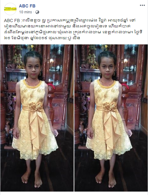 ប្រកាសរកក្មេងស្រីអាយុ១៤ឆ្នាំ ដែលបានបាត់ខ្លួនពីផ្ទះ អត់បានចូលសាលារៀនហើយថែមទាំងយកសម្លៀកបំពាក់ទៅជាមួយ