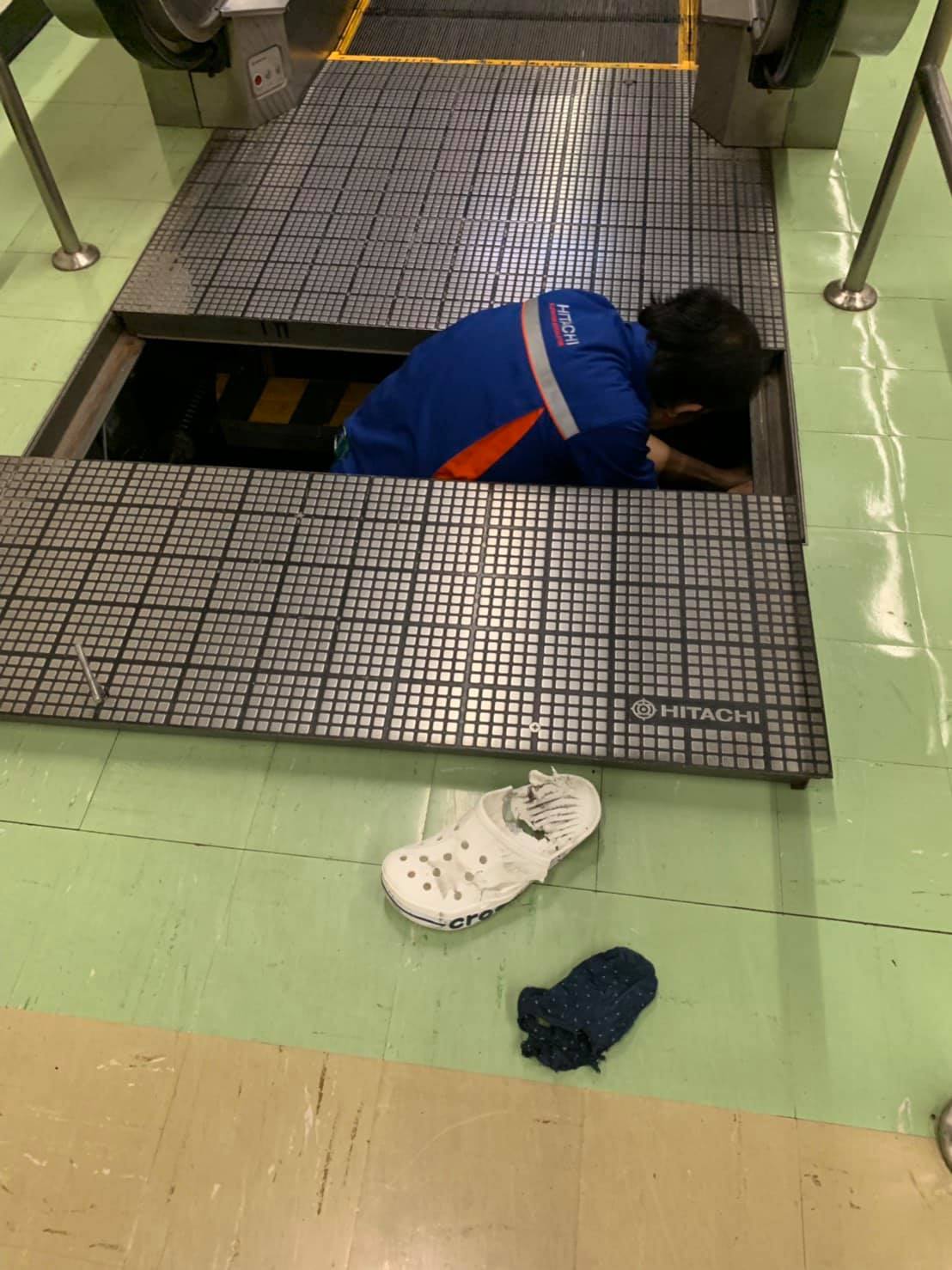 ប្រុងប្រយ័ត្ន! បុរសម្នាក់ប៊ិះនឹងមានគ្រោះថ្នាក់ដោយសារជាប់ជើងនឹងជណ្តើរយន្ត ជាសំណាងល្អរូបគេដោះស្បែកជើងរត់ចេញទាន់ពេល