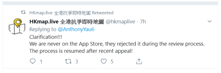 កាលពីពេលថ្មីៗនេះ តាមរយៈគណនេយ្យ Twitter របស់ HK Map Live បានប្រកាសថា ក្រុមហ៊ុន Apple បានបដិសេធមិនដំណើរការកម្មវិធីរបស់ខ្លួនឡើយនៅលើ App Store ដែលជាវិធីតែមួយគត់សម្រាប់អ្នកប្រើប្រាស់ iPhone ធ្វើការដោនឡូតយកមកប្រើ៕