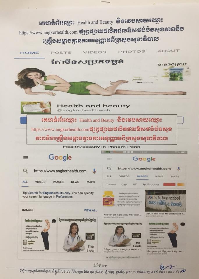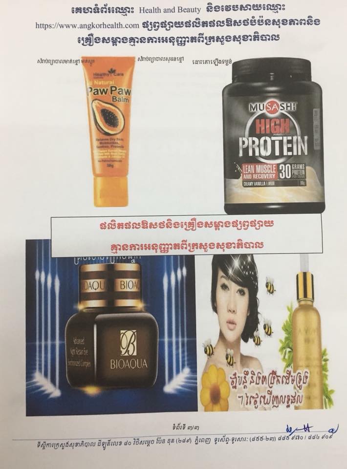 សេចក្តីជូនដំណឹងនេះចុះផ្សាយថ្ងៃទី០២ ខែមេសា ឆ្នាំ២០១៨ ស្តីពីគេហទំព័រឈ្មោះ Health and Beauty និងវេបសាយឈ្មោះ https://www.angkorhealth.com ផ្សព្វផ្សាយផលិតផលឱសថបំប៉នសុខភាព និងគ្រឿងសម្អាងគ្មានច្បាប់អនុញ្ញាតពីក្រសួងសុខាភិបាល។