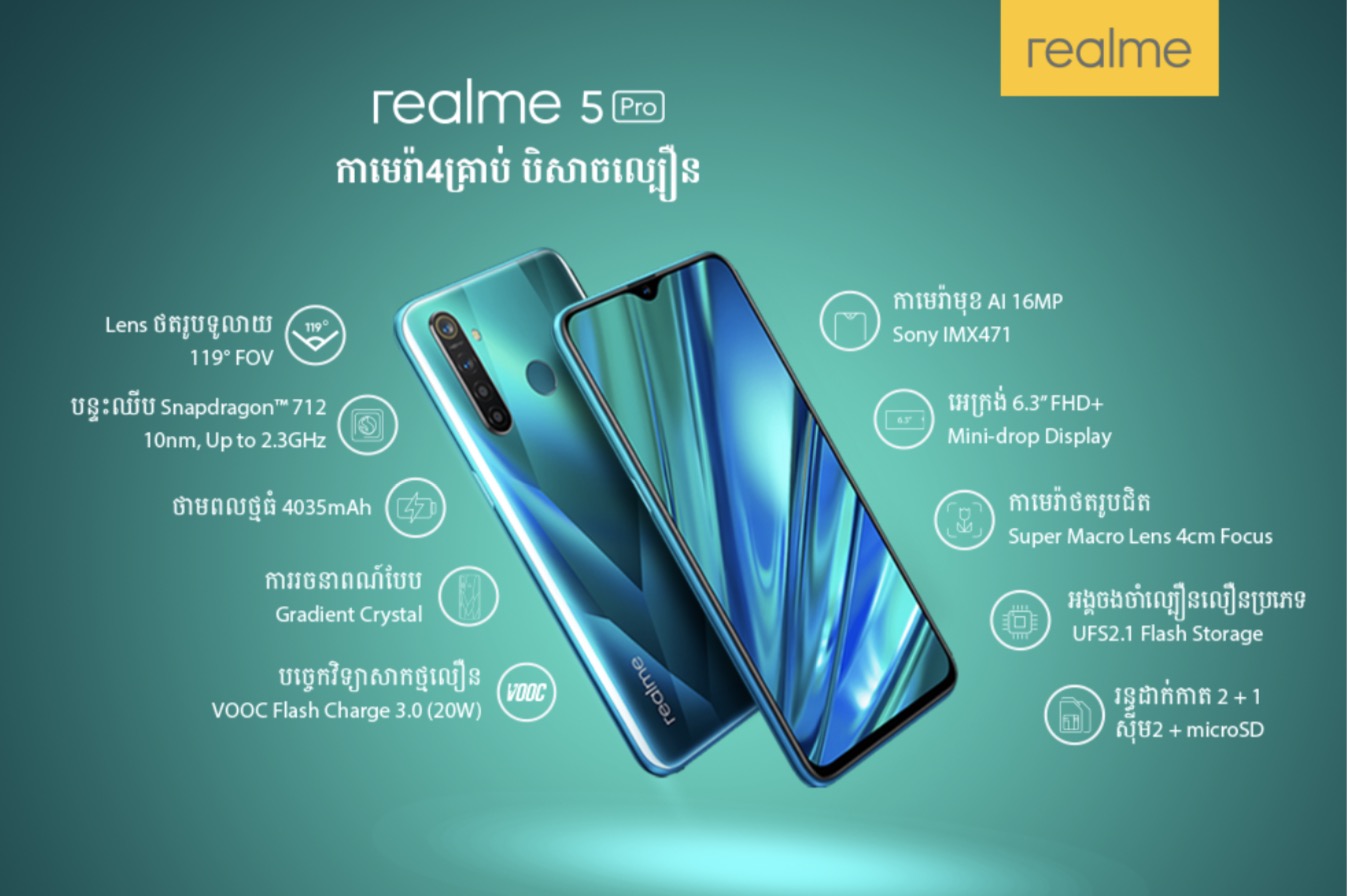 ក្រៅពី OPPO និង VIVO ថ្មីៗនេះមានម៉ាកស្មាតហ្វូនថ្មី ដែលខ្លួនតូចថ្លើមធំ ហ៊ានហក់ចូលទីផ្សារស្មាតហ្វូននៅកម្ពុជា ដោយបំពាក់កាមេរ៉ាក្រោយ ៤គ្រាប់ដូចគេឯង មិនខ្លាចរអែងចិត្តបងៗឡើយនោះ គឺ realme ។ តាមអ្វីដែលយើងបានសិក្សាកន្លងមកឃើញថា ស្មាតហ្វូន realme ត្រូវបានផលិតក្រោម សង្វាក់ផលិតកម្ម និង ការគ្រប់គ្រងគុណភាពជាមួយ OPPO ដែរ ក៏ប៉ុន្តែការរចនាប្រអប់វិញ ពណ៌លឿងដិត ឆើតឆាយ ត្រូវចិត្ត Team យុវវ័យតែម្តង ជាពិសេស Team Yellow ខប់ ខប់ណាស់ ។ ម៉ាកប្រេនថ្មីមួយនេះ ត្រូវបាននាំយកម៉ូឌែល ២ មកកាន់ប្រទេសកម្ពុជាបើកឆាកដំបូងកាលពីថ្ងៃទី 16 វិច្ឆិកា ឆ្នាំ 2019 ដែលមានម៉ូឌែល realme 5 និង realme 5 Pro ឡើងរង្គោះរង្កើរាមច្បងជាច្រើន ទាំងកម្លាំងថ្មប្រហាក់ប្រហែល ជាពិសេសគឺតម្លៃវាផ្ទាល់តែម្តង គឺថាស៊ីផុយ 279$។