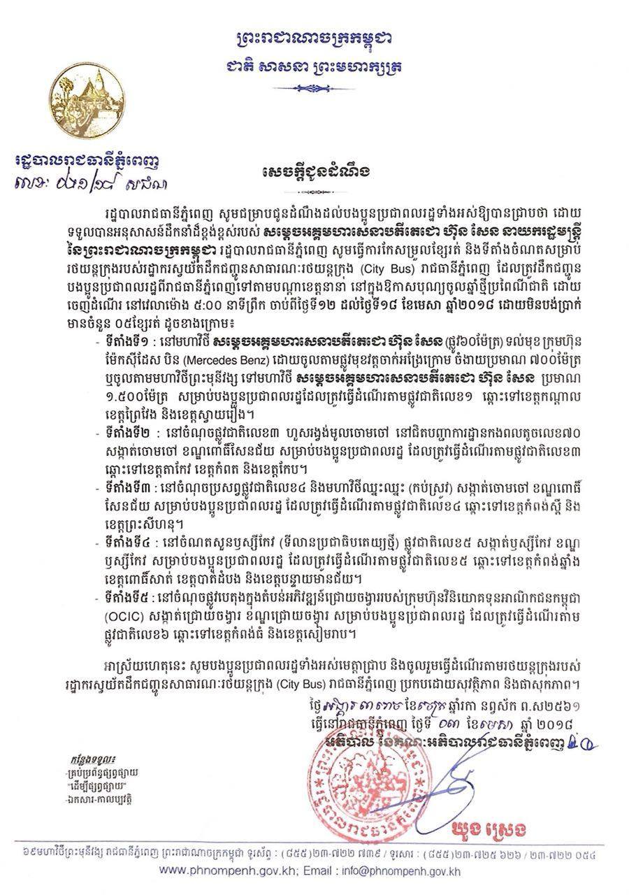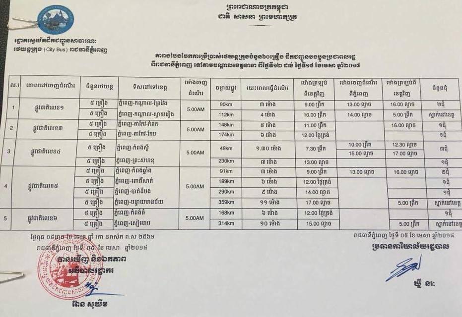 កាលពីពេលកន្លងទៅថ្មីៗនេះ រាជរដ្ឋាភិបាលបានប្រកាសឲ្យបងប្អូនប្រជាពលរដ្ឋទាំងអស់អាចជិះរថយន្តក្រុងពីរាជធានីភ្នំពេញ ទៅកាន់ស្រុកកំណើត ដោយមិនបង់ប្រាក់ចាប់ពីថ្ងៃទី១២ ខែមេសា ឆ្នាំ២០១៨នេះ ដើម្បីផ្តល់ភាពងាយស្រួលជូនប្រជាពលរដ្ឋ។ ខាងក្រោមនេះគឺជាតារាពេលវេលាម៉ោងចេញ និងម៉ោងត្រលប់មកវិញ ដូច្នេះសូមបងប្អូនមើលឲ្យបានច្បាស់លាស់ ប្រយ័ត្នខកជើងធ្វើដំណើរ!