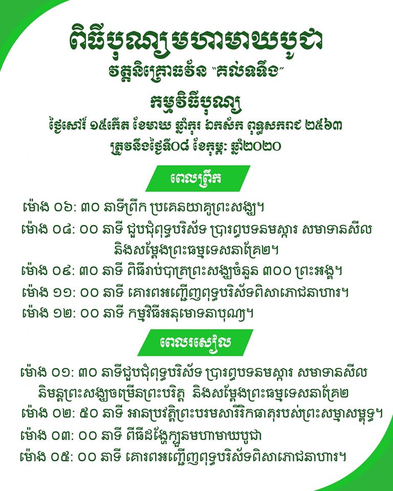 ថ្ងៃសៅរ៍ ១៥កើត ខែមាឃ ឆ្នាំកុរ ឯកស័ក ពុទ្ធសករាជ ២៥៦៣ ត្រូវនឹងថ្ងៃសៅរ៍ ទី០៨ ខែកុម្ភៈ ឆ្នាំ២០២០ គឺមានពិធីសាសនាដ៏ធំ មួយគឺបុណ្យ “មាឃបូជា” គឺរំឭកទៅដល់ថ្ងៃដែលព្រះសម្មាសម្ពុទ្ធទ្រង់ដាក់អាយុសង្ខារ។ យ៉ាងណាមិញក៏មានពុទ្ធសាសនិកជាច្រើននាំយកចង្ហាន់ទៅប្រគេនព្រះសង្ឃ ជាពិសេសស្អែកនេះនៅ វត្តនិគ្រោធវ័ន “គល់ទទឹង” ដែលមានទីតាំងនៅភូមិកោះក្របី សង្កាត់ព្រែកថ្មី ខណ្ឌច្បារអំពៅ រាជធានីភ្នំពេញ នឹងមានការរៀបចំរាប់បាត្រព្រះសង្ឃ ៣០០អង្គ បង្ហូតទង់សាសនា និងបង្ហោះប៉េងប៉ោងចំនួន២៥០០។ ខាងក្រោមនេះជារបៀបវារៈប្រារព្ធមាឃបូជាសម្រាប់ថ្ងៃស្អែក សូមពុទ្ធសាសនិកចូលរួមឲ្យបានច្រើនកុះករ៕