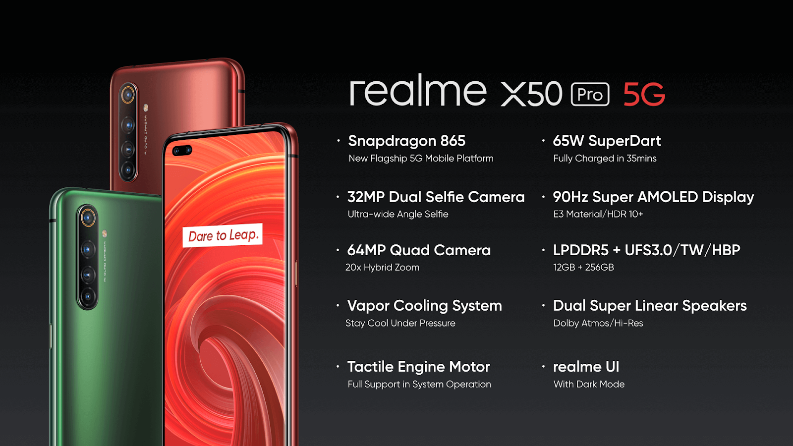 ក្នុងនាមជាស្មាតហ្វូនកំពូល 5G ដំបូងបង្អស់របស់ realme X50 Pro 5G ដំណើរការដោយប្រព័ន្ធឈីប Qualcomm® Snapdragon 865 5G មានបំពាក់មុខងារ 65W SuperDart Flash Charge, កាមេរ៉ា 64MP Hawk Eye AI 4 គ្រាប់, កាមេរ៉ាភ្លោះទំហំ 32MP សម្រាប់ថតប្លង់ទូលាយក្នុងការសេលហ្វី និងអេក្រង់កម្រិត 90Hz Super AMOLED ។ វាជាស្មាតហ្វូនស៊េរី 5G ដែលមានដំណើរការល្អឥតខ្ចោះ។ ក្នុងនាមជា“ អ្នកពេញនិយមនៃ 5G” និង“ អ្នកពេញនិយមនៃរបៀបរស់នៅបែបបច្ចេកវិទ្យា” realme នឹងបន្តផលិតស្មាតហ្វូនដែលមានលក្ខណៈទាន់សម័យជាងមុននិងនាំរបៀបរស់នៅរបស់អតិថិជនវ័យក្មេងដើម្បីបង្កើតស្មាតហ្វូន 5G បន្ថែមទៀតជាមួយនឹងការភ្ញាក់ផ្អើល។