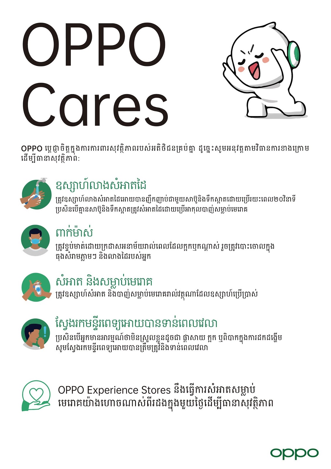 ស្របពេលវីរុសកូវីដ19 (កូរ៉ូណា) កំពុងរីករាលដាលស្ទើរតែគ្រប់ប្រទេសជុំវិញពិភពលោក និងបន្តគំរាមគំហែងសុខភាពសាធារណៈ ក្រុមហ៊ុន OPPO បានចាត់វិធានការអនាម័យនៅតាមមជ្ឈមណ្ឌលជួសជុលទូរស័ព្ទដៃ OPPO តាមរយៈការបាញ់ថ្នាំសម្លាប់មេរោគពីរដងក្នុងមួយថ្ងៃ រាល់បុគ្គលិកក្រុមហ៊ុនតម្រូវឲ្យពាក់ម៉ាស និងពិនិត្យសីតុណ្ហភាព មុនពេលចាប់ផ្តើធ្វើការជារៀងរាល់ថ្ងៃ (ក្នុងករណីក្តៅខ្លួន ឬមិនស្រួលខ្លួន ក្រុមហ៊ុនអនុញ្ញាតសម្រាកនៅផ្ទះ ឬជួបពេទ្យ) ទូរស័ព្ទត្រូវបានសម្អាតរៀងរាល់ពីរម៉ោងម្តង និងទឹកអាល់កុលលាងដៃ ដើម្បីធានានូវសុខសុវត្ថិភាពដល់អតិថិជន និងអ្នកគាំទ្រ។