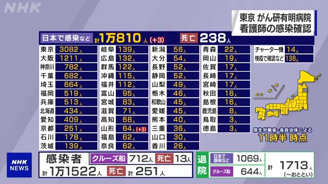 ចំនួននៃការឆ្លងវីរុស COVID-19 នៅប្រទេសជប៉ុនពេលនេះ មានចំនួន ១០,៨១០ គិតត្រឹមម៉ោង ១១ និង ៣០នាទី ព្រឹកថ្ងៃច័ន្ទ (ម៉ោងនៅជប៉ុន) ហើយនេះមិនរាប់បញ្ចូលករណីពីនាវាទេសចរណ៍ Diamond Princess នោះទេ។ ការបូកសរុបនេះរួមបញ្ចូលទាំងមនុស្សដែលត្រូវបានគេរកឃើញវិជ្ជមានជាមួយវីរុស ក្នុងកំឡុងពេលត្រួតពិនិត្យការហោះហើរ មន្រ្តីក្រសួងសុខាភិបាល និងអ្នកដែលវិលមកជប៉ុនវិញតាមយន្តហោះដឹកជញ្ជូន។