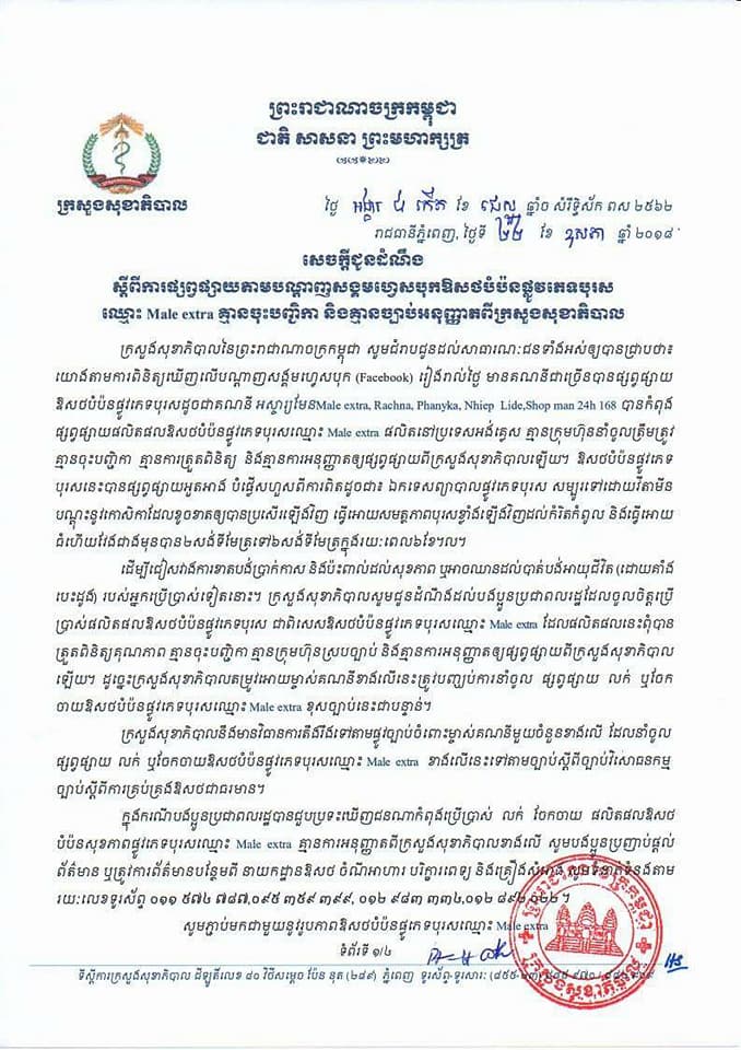 យោងតាមសេចក្តីដូចដំណឹងរបស់ក្រសួងសុខាភិបាលចុះផ្សាយថ្ងៃទី២២ ខែឧសភា បានឲ្យដឹងថា ដើម្បីជៀសវាងការខាតបង់ប្រាក់កាស និងប៉ះពាល់ដល់សុខភាព ឬអាចឈានដល់បាត់បង់អាយុជីវិត (ដោយគាំងបេះដូង) ក្រសួងបានធ្វើការហាមប្រាមមិនឲ្យចែកចាយ និងប្រើប្រាស់ផលិតផលឱសថបំប៉នផ្លូវភេទបុរសឈ្មោះ Male Extra ដែលផលិតនៅប្រទេសអង់គ្លេស ដោយសារតែផលិតផលនេះគ្មានក្រុមហ៊ុននាំចូលត្រឹមត្រូវ គ្មានចុះបញ្ចីកា គ្មានការត្រួតពិនិត្យ និងគ្មានការអនុញ្ញាតឲ្យផ្សព្វផ្សាយពីក្រសួងឡើយ។