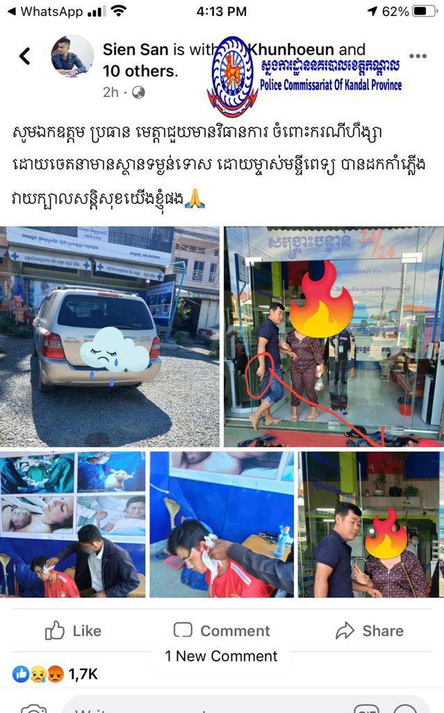 ក្រុមការងារព័ត៌មាន និងប្រតិកម្មរហ័ស នៃស្នងការដ្ឋាននគរបាលខេត្តកណ្តាល មានកិត្តិយសសូមធ្វេីការបំភ្លឺឆ្លេីយតបជូនបណ្តាញសារព័ត៌មាន សាធារណជន និងម្ចាស់គណនីហ្វេសបុកឈ្មោះ Sien San ដែលបានផ្សព្វផ្សាយមានខ្លឹមសារថា «សូមឯកឧត្តម ប្រធាន មេត្តាជួយមានវិធានការចំពោះករណីហិង្សាដោយចេតនាមានស្ថានទម្ងន់ទោស ដោយម្ចាស់មន្ទីរពេទ្យបានដកកាំភ្លើងវាយក្បាលសន្តិសុខយើងខ្ញុំផង» ។