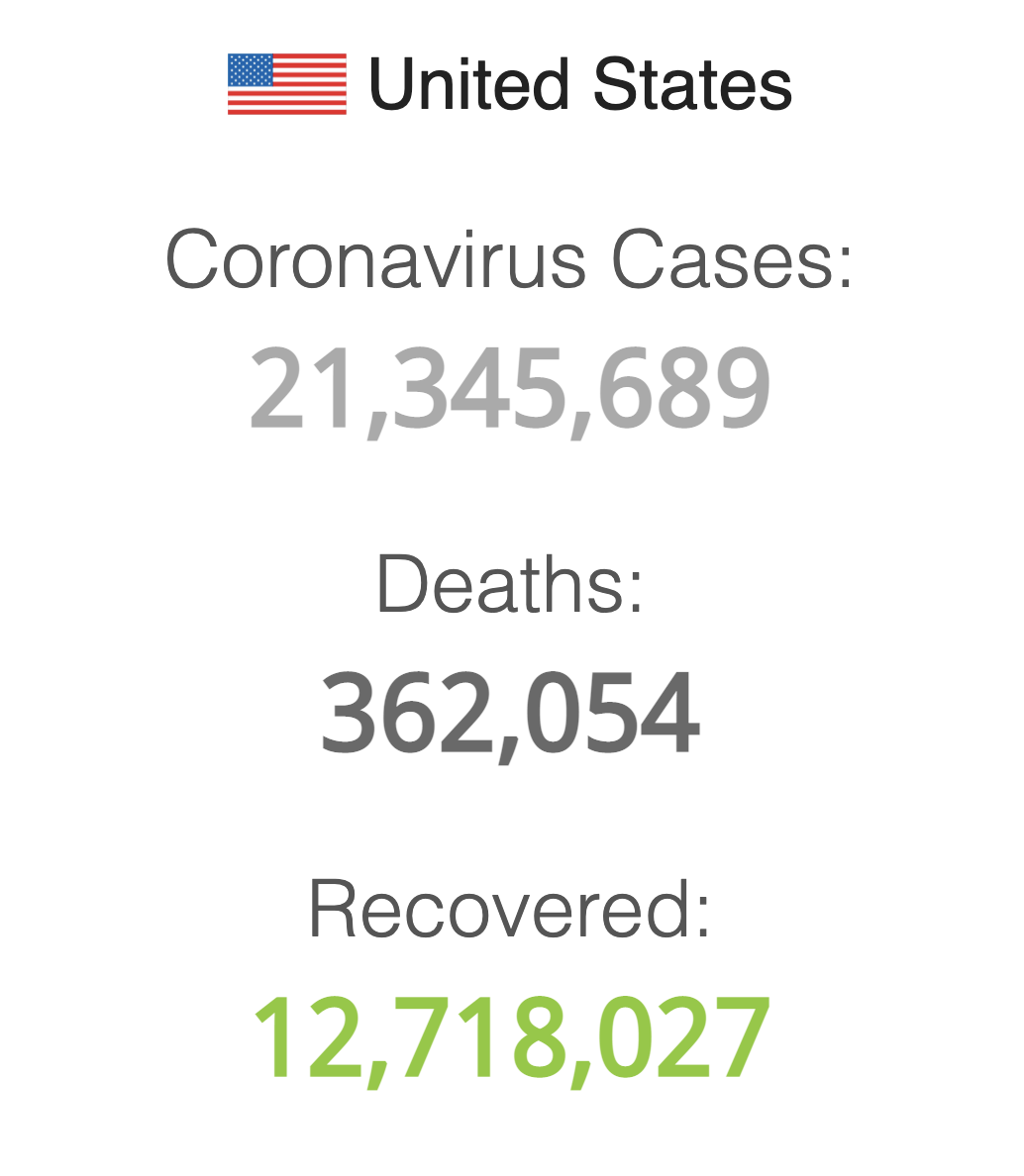 (អន្តរជាតិ)៖ យោងតាមតួលេខស្តីពីចំនួនអ្នកឆ្លង និងស្លាប់ដោយសារវីរុសកូវីដ១៩ ចេញពីគេទំព័រអន្តរជាតិ Worldometer បានបង្ហាញថា នាព្រឹកថ្ងៃទី៥ ខែមករា ឆ្នាំ២០២១នេះ ចំនួនអ្នកឆ្លងជំងឺកូវីដ-១៩ នៅសហរដ្ឋអាម៉េរិក បានកើនដល់ ២១,៣១៣,៨៦៣ នាក់ក្នុងនោះអ្នកជំងឺសរុប ១២,៦៦៥,១១០ បានជាសះស្បើយ និងជាង ៣៦ម៉ឺននាក់បានស្លាប់ ខណៈដែលព្រឹកនេះសហរ្ឋអាម៉េរិក បានរកឃើញករណីឆ្លងថ្មីសរុប ១៥៣,៥០៨នាក់ និងអ្នកជំងឺសរុប ១,៥៨៤នាក់ បានស្លាប់។