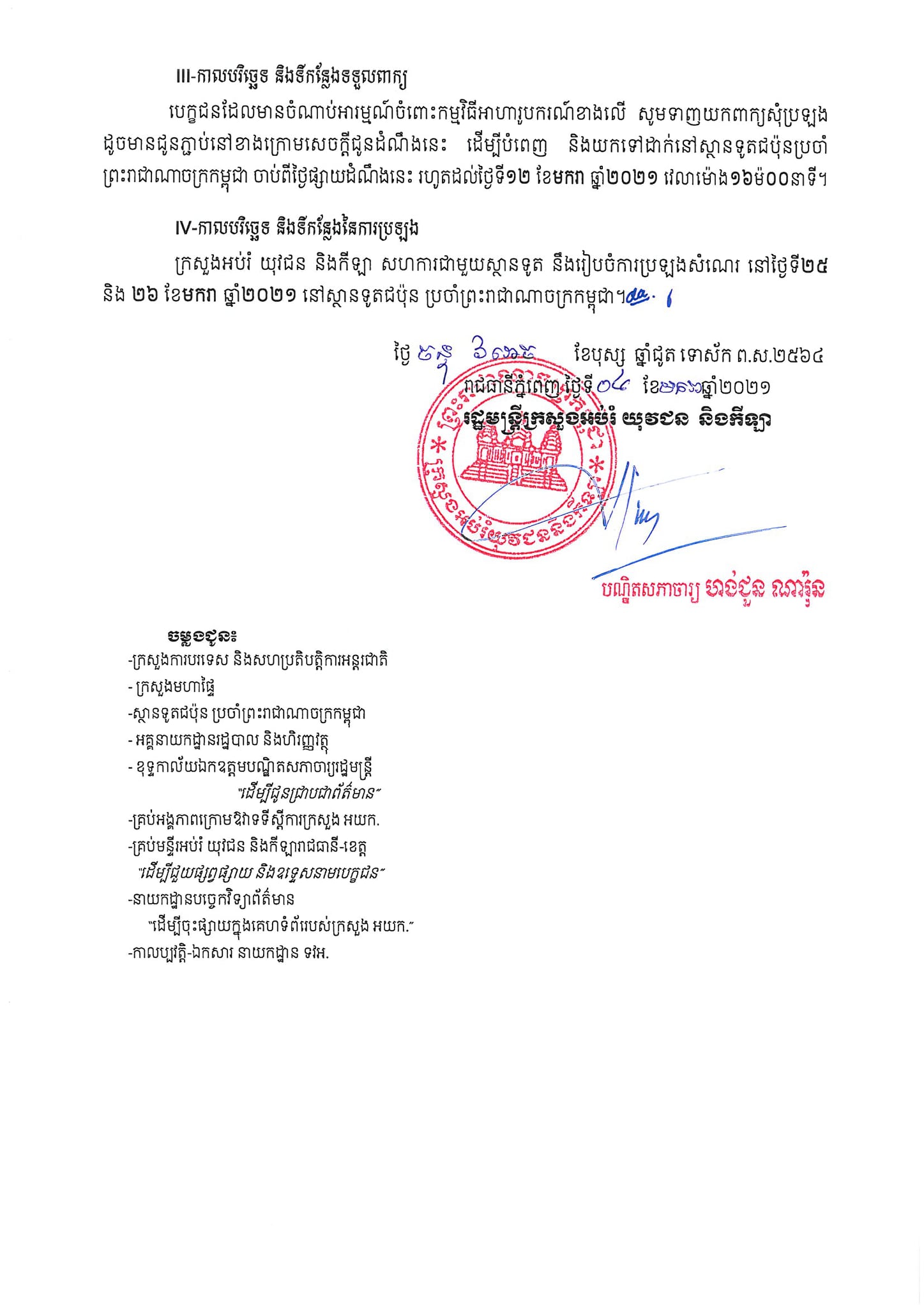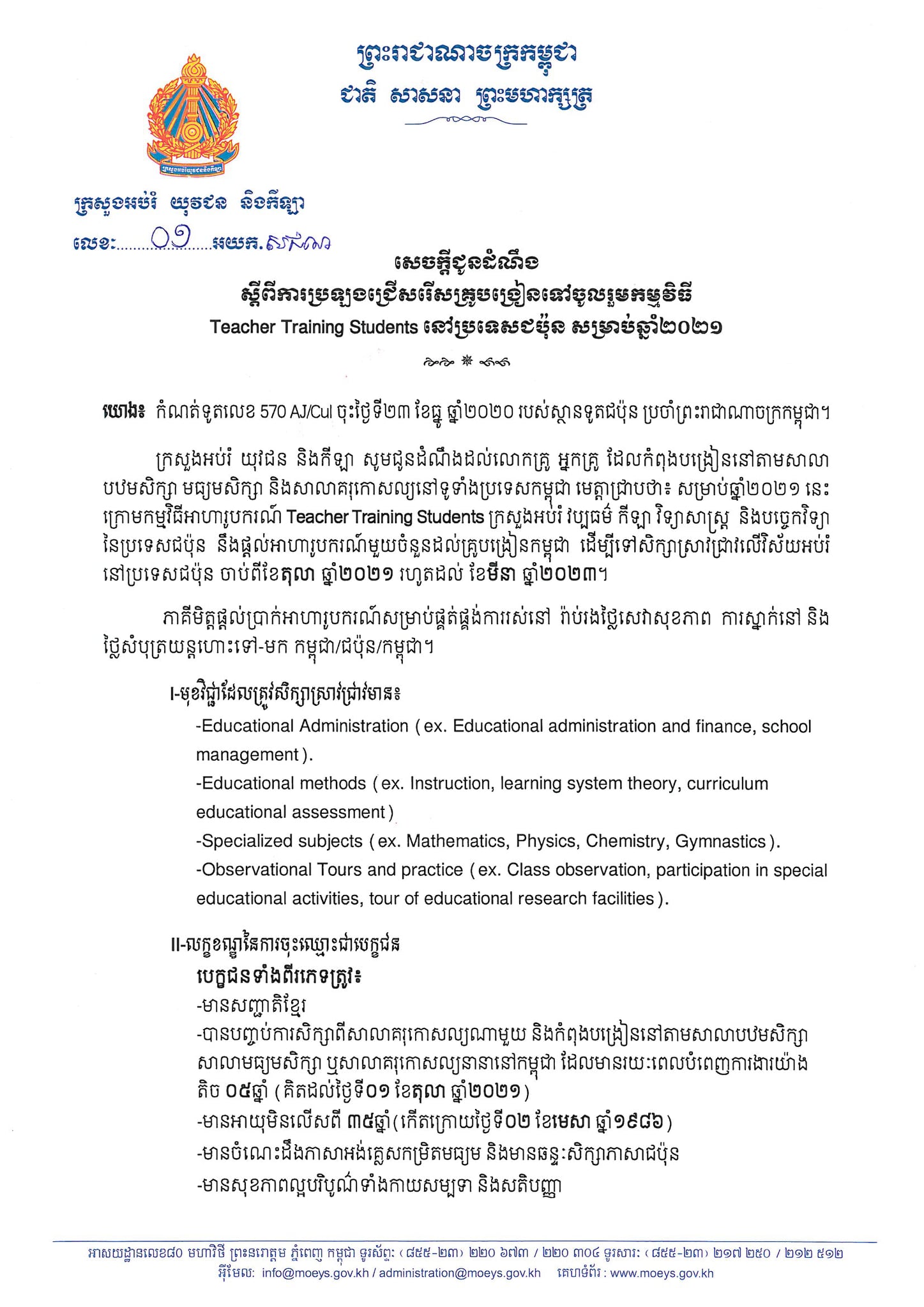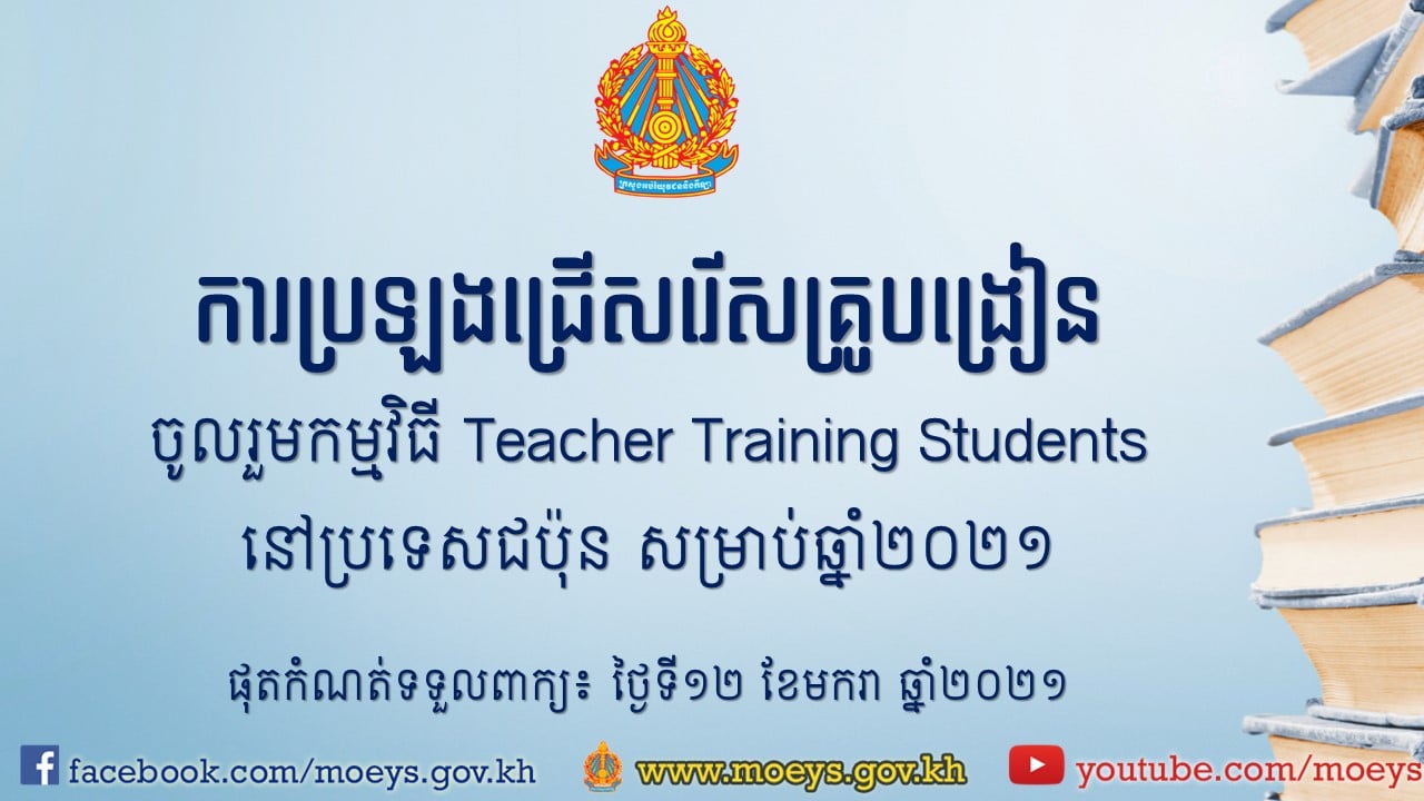 ក្រសួងអប់រំ យុវជន និងកីឡា សូមជូនដំណឹងដល់លោកគ្រូ អ្នកគ្រូ ដែលកំពុងបង្រៀននៅតាមសាលាបឋមសិក្សា មធ្យមសិក្សា និងសាលាគរុកោសល្យនៅទូទាំងប្រទេស មេត្តាជ្រាបថា សម្រាប់ឆ្នាំ២០២១ នេះ ក្រោមកម្មវិធីអាហារូបករណ៍ Teacher Training Students ក្រសួងអប់រំ វប្បធម៌ កីឡា និងវិទ្យាសាស្ត និងបច្ចេកវិទ្យានៃប្រទេសជប៉ុន នឹងផ្តល់អាហារូបករណ៍មួយចំនួនដល់គ្រូបង្រៀនកម្ពុជា ដើម្បីទៅសិក្សាស្រាវជ្រាវលើវិស័យអប់រំនៅប្រទេសជប៉ុនចាប់ពីខែតុលា ឆ្នាំ២០២១ រហូតដល់ខែមីនា ឆ្នាំ២០២៣។