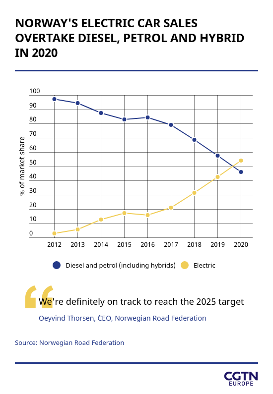 យោងតាមការចុះផ្សាយរបស់សារព័ត៌មាន CGTN បានឱ្យដឹងថា ទិន្នន័យថ្មីមួយដែលចេញដោយសហព័ន្ធផ្លូវនៃប្រទេសន័រវេស (OFV) បង្ហាញថា ការលក់រថយន្តអគ្គិសនីនៅប្រទេសន័រវែស បានវ៉ាដាច់ទាំងរថយន្តសាំង ម៉ាស៊ូត និងកូនកាត់រួមបញ្ចូលគ្នា នៅក្នុងឆ្នាំ២០២០។ វាជាលើកទីមួយហើយដែលមានប្រទេសមួយនៅលើពិភពលោកនេះ អាចមានការលក់រថយន្តអគ្គិសនីបានច្រើនជាងរថយន្តមានចំហេះ ហើយវាបានកើតឡើងក្រោយ ១០ឆ្នាំ ដែលរថយន្តប្រភេទនេះមានត្រឹមតែ ១% ប៉ុណ្ណោះ នៅក្នុងទីផ្សាររថយន្តថ្មីរបស់ន័រវែស។