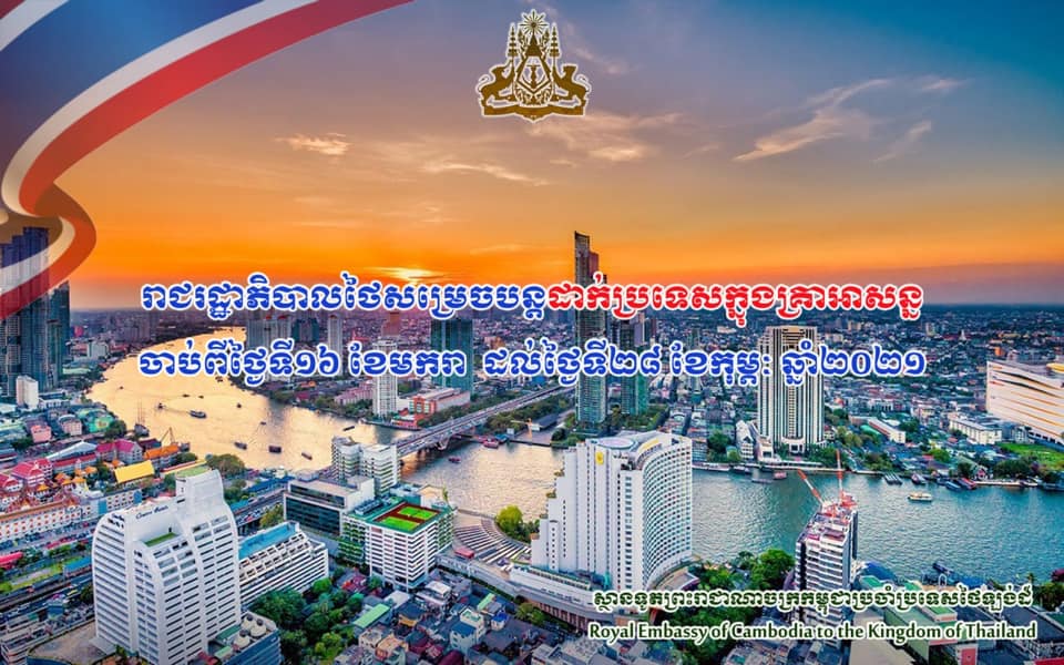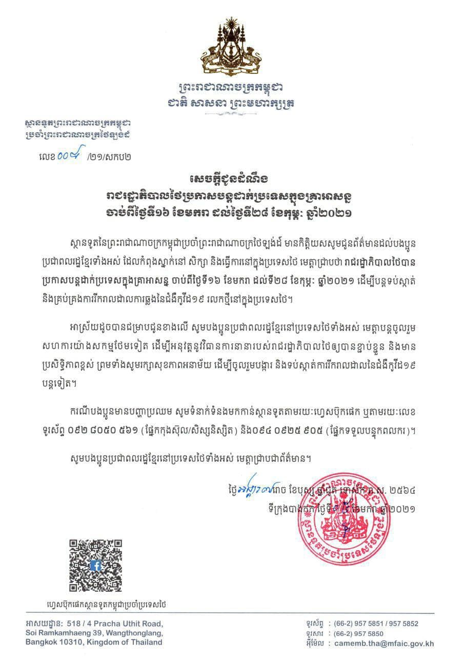 យោងតាមសេចក្តីជូនដំណឹងពីស្ថានទូតព្រះរាជាណាចក្រកម្ពុជាប្រចាំព្រះរាជាណាចក្រថៃឡង់ដ៍ បានជូនដំណឹងដល់បងប្អូនប្រជាពលរដ្ឋខ្មែរទាំងអស់ ដែលកំពុងស្នាក់នៅ សិក្សា និងធ្វើការនៅក្នុងប្រទេសថៃ មេត្តាជ្រាបថា រដ្ឋាភិបាលថៃបានប្រកាសបន្តដាក់ប្រទេសក្នុងគ្រាអាសន្ន ចាប់ពីថ្ងៃទី១៦ ខែមករា ដល់ថ្ងៃទី២៨ ខែកុម្ភៈ ឆ្នាំ២០២១ ដើម្បីបន្តទប់ស្កាត់ និងគ្រប់គ្រងការរីករាលដាលការឆ្លងជំងឺកូវីដ១៩ រលកថ្មីនៅក្នុងប្រទេសថៃ។