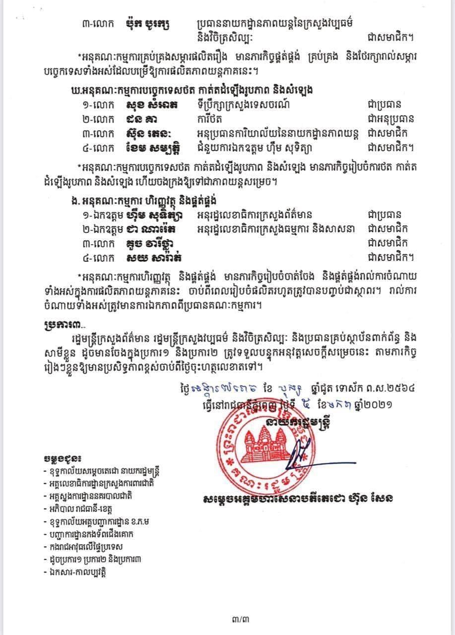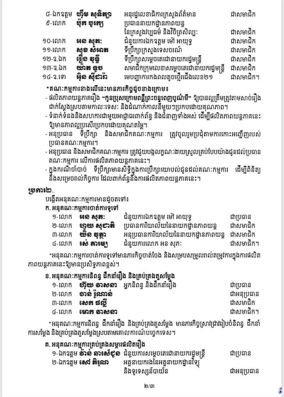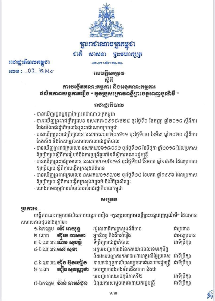 រាជរដ្ឋាភិបាលកម្ពុជា សម្រេចបង្កើតគណៈកម្មការ និងអនុគណៈកម្មការផលិតភាពយន្តភាគរឿង “កូនប្រុសក្រោមពន្លឺព្រះច័ន្ទពេញបូណ៍មី”