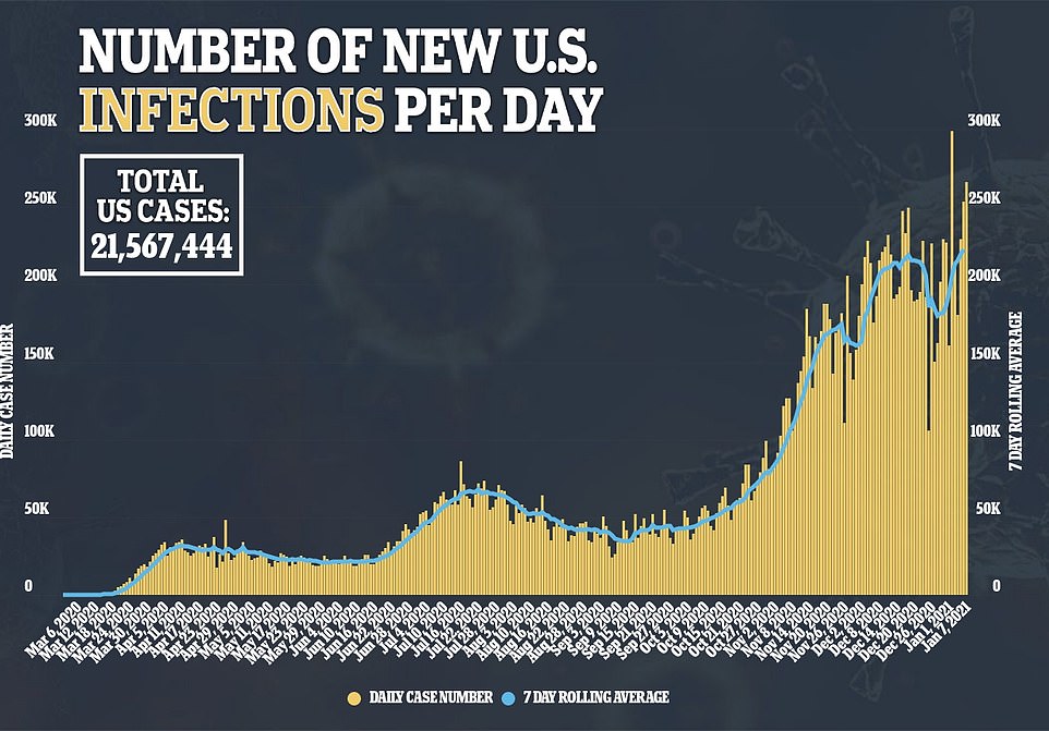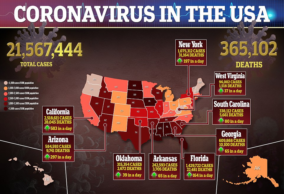 សប្តាហ៍ទី០១ នៃឆ្នាំ២០២១ មានករណីឆ្លងជំងឺ COVID-19 ខ្ពស់បំផុត និងខ្ពស់ជាងសប្តាហ៍ដទៃទៀតក្នុងកំឡុងពេលមានជំងឺរាតត្បាត ទោះបីជាអំឡុងពេលបុណ្យណូអែល និងចូលឆ្នាំថ្មីមានការថយចុះក៏ដោយ ប៉ុន្តែយ៉ាងណានេះប្រហែលជាដោយសារថា វាជាអំឡុងថ្ងៃសម្រាក ទើបតួលេខមានការចុះថយ។ មន្ទីរពេទ្យនៅតាមរដ្ឋមួយចំនួនកំពុងរថសម្ពាធយ៉ាងខ្លាំង ដោយសារចំនួនអ្នកជំងឺចូលសម្រាកនៅក្នុងមន្ទីរពេទ្យមានច្រើនពេក។ ជាក់ស្ដែងនៅរដ្ឋ Arizona កាលពីថ្ងៃពុធត្រូវបានប្រកាសថា ជាចំណុចកណ្ដាលនៃការឆ្លងចុងក្រោយបំផុត ហើយ California នៅតែជាទីតាំងមានការឆ្លងអាក្រក់បំផុត។