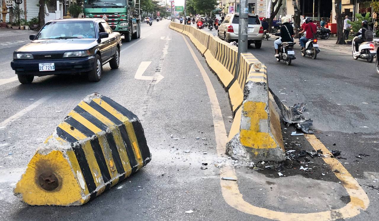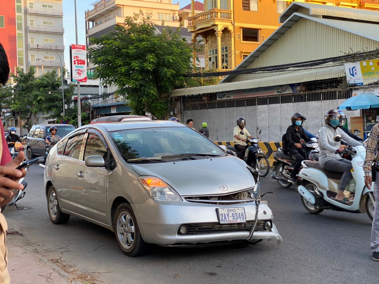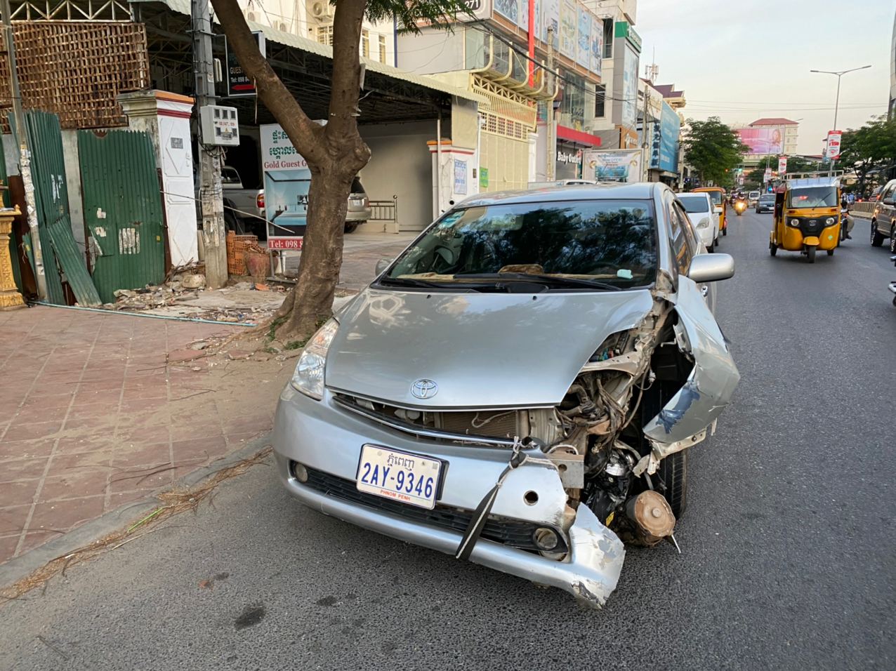 រាជធានីភ្នំពេញ ៖ រថយន្ត TOYOYA PRIUS មួយគ្រឿងបោះពួយក្នុងល្បឿនលឿន ខ្វះការប្រុងប្រយ័ត្ន ត្រង់ចំណុចស្តុបផ្លូវបំបែកជាបួន និងស្ថានភាពផ្លូវរាងកោងទៀត បានអកហ្សឺចាប់ហ្វ្រាំងមិនទាន់ គេចរ៉ឺម៉កដឹកបន្លែមួយគ្រឿង ក៏ជ្រុលទៅបុករបាំងថ្មពុះចែកទ្រូងផ្លូវពេញទំហឹង បណ្តាលឲ្យរបាំងថ្មមួយផ្ទាំងខ្ទាតទៅគន្លងផ្លូវម្ខាងទៀត ចំណែកឯរថយន្តបង្កបានបាក់កាឡេកង់មុខខាងឆ្វេងបើកទៅមុខលែងរួច តែអ្នកបើកបរហៅរថយន្តមកសណ្ដោងចេញពីកន្លែងកើតហេតុ តែត្រូវគេឃើញទាន់ ក៏រាយការណ៍ប្រាប់សមត្ថកិច្ចមូលដ្ឋានចុះមកឃាត់រថយន្តតែម្ដង។