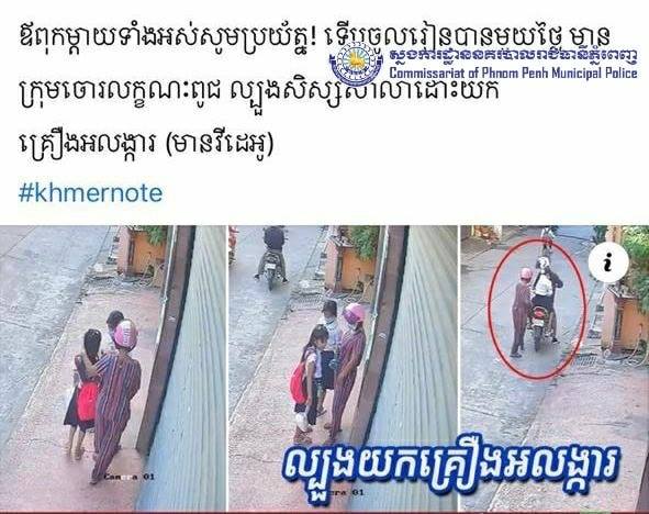 សេចក្តីបកស្រាយបំភ្លឺរបស់ក្រុមការងារព័ត៌មាន​ និងប្រតិកម្មរហ័សនៃស្នងការដ្ឋាននគរបាលរាជធានីភ្នំពេញ​ ទាក់ទងទៅនឹងករណីលួច​ដោះយកកងដៃនិងខ្សែកសិស្សសាលាបានឲ្យដឹងថា នៅថ្ងៃទី០៩​ ខែមករា​ ឆ្នាំ២០២១​ វេលាម៉ោង០៧និង១៥នាទី​ នៅចំណុចផ្លូវបេតុង​ ភូមិមិត្តភាព​ សង្កាត់ឫស្សីកែវ​ ខណ្ឌឫស្សីកែវ​ រាជធានីភ្នំពេញ​ ពិតជាមានករណីលួងលោមក្មេងស្រីដេីម្បីដោះយកគ្រឿងអលង្ការ​ ជនរងគ្រោះឈ្មោះ​ ម៉ៅ​ ម៉ាលីកា​ ភេទស្រី​ អាយុ១០ឆ្នាំ​ ជាសិស្សថ្នាក់ទី៤​​ មានទីលំនៅផ្ទះលេខB16 ផ្លូវបេតុង​ ក្រុមទី០១​ ភូមិឃ្លាំងសាំង​ សង្កាត់ឫស្សីកែវ​ ខណ្ឌឫស្សីកែវ រាជធានីភ្នំពេញ​ ។ សំភារ:បាត់បង់រួមមានខ្សែក​ ០១ខ្សែ​មានតម្លៃ​ ២៣០ដុល្លារ​ ​ និងកងដៃ​ ០១កងមានតម្លៃ​ ១៧០ដុល្លារ។