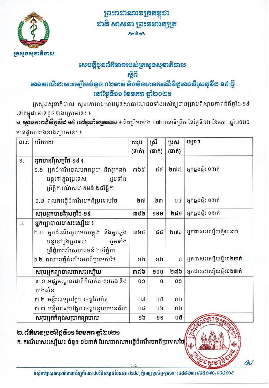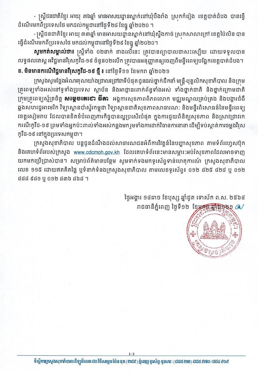 នៅព្រឹកថ្ងៃទី១២ ខែមករា ឆ្នាំ២០២១នេះ ក្រសួងសុខាភិបាលកម្ពុជា បានចេញសេចក្តីជូនដំណឹងពី ករណីជាសះស្បើយជំងឺកូវីដ១៩ ចំនួន០២នាក់ និងមិនមានករណីវិជ្ជមានវីរុសកូវីដ១៩ថ្មីនោះទេ។