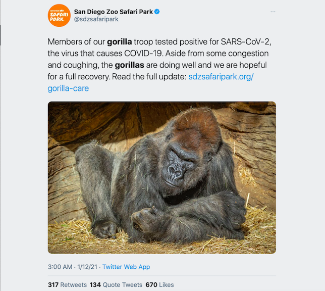 Members of our gorilla troop tested positive for SARS-CoV-2, the virus that causes COVID-19. Aside from some congestion and coughing, the gorillas are doing well and we are hopeful for a full recovery. Read the full update: https://t.co/HIezWKBFxG pic.twitter.com/MAkPYPzxWP