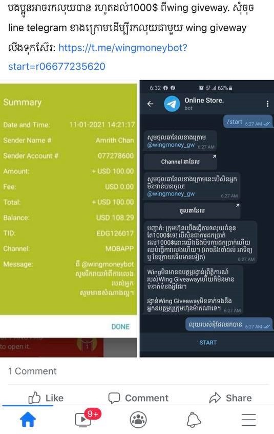 សូមប្រយ័ត្ន មានជនខិលខូចកំពុងតែប្រើល្បិចលួចយកព័ត៌មានគណនីវីង (Wing) តាមរយៈកម្មវិធី Telegram ដោយវិធីសាស្ត្រនេះ