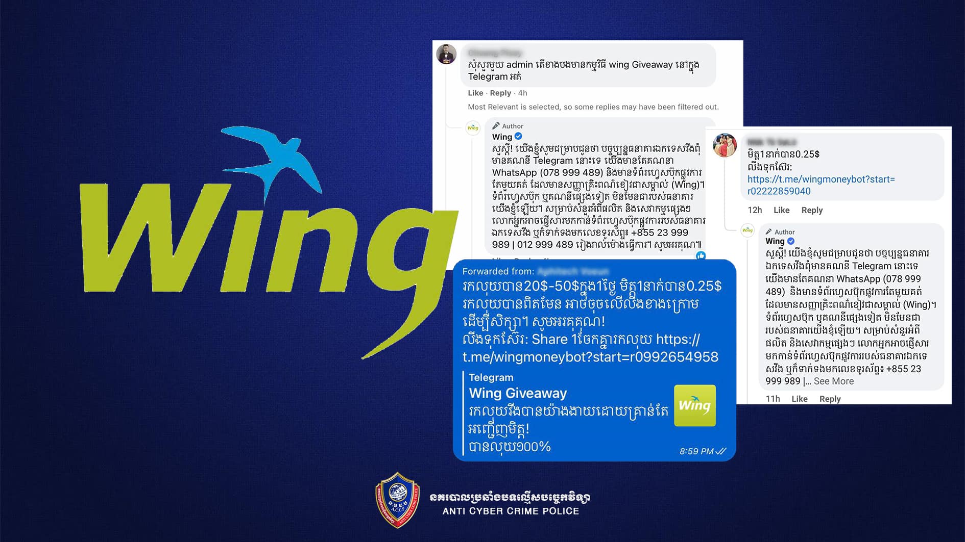 បើតាមការឆ្លើយតបរបស់ក្រុមហ៊ុន Wing តាមរយៈសារឆ្លើយឆ្លង (Comments) គឺក្រុមហ៊ុនពុំមានប្រើប្រព័ន្ធទំនាក់ទំនង Telegram ទេ ដូច្នេះសូមលោកអ្នកកុំចុចលើតំណភ្ជាប់នោះ ហើយសូមបញ្ឈប់ការចែកចាយ ព័ត៌មាននេះតាមបណ្ដាញទំនាក់ទំនងសង្គមទៀត។ នាយកដ្ឋានសូមឱ្យបងប្អូនអ្នកប្រើប្រាស់ មានការប្រុងប្រយ័ត្នជាមួយការបោកបញ្ឆោតមួយចំនួនមានដូចជា ការឈ្នះរង្វាន់ ការទទួលបានទំនិញផ្ញើពីបរទេសដែលទាមទារឱ្យលោកអ្នកបង់ប្រាក់ជាមុន ឬទាមទារយកទិន្នន័យផ្ទាល់ខ្លួននោះ ព្រោះនេះគឺជាល្បិចរបស់ជនខិលខូចដើម្បីបោកបញ្ឆោតយកប្រាក់កាសរបស់លោកអ្នក ឬយកទិន្នន័យទាំងនោះដើម្បីលួចចូលគណនី និងធ្វើការបោកបញ្ឆោតផ្សេងៗទៀតតែប៉ុណ្ណោះ ៕