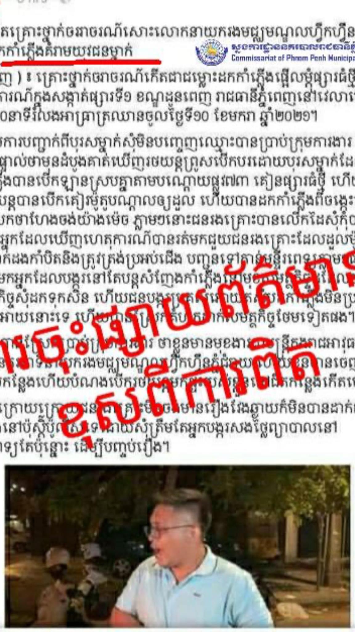 ក្រុមការងារព័ត៌មាន និងប្រតិកម្មរហ័សនៃស្នងការដ្ឋាននគរបាលរាជធានីភ្នំពេញ បានធ្វើការបំភ្លឺថា៖ “ទាក់ទងទៅនឹងសារព័ត៌មានមួយចំនួនដែលបានចុះផ្សាយព័ត៌មានខុសពីការពិតលេីករណីគ្រោះថ្នាក់ចរាចរណ៍មួយរវាងរថយន្ត និងម៉ូតូ ដែលកេីតឡេីងនៅវេលាម៉ោង ៤:៣០នាទីព្រឹកថ្ងៃទី១០ ខែមករា ឆ្នាំ២០២០។