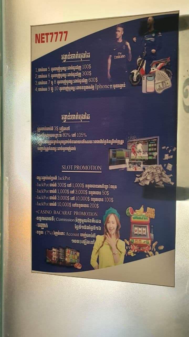 ភ្នំពេញ ៖ នាយកដ្ឋានប្រឆាំងបទល្មើសល្បែងពាណិជ្ជកម្មដោយមានការសម្របសម្រួលពីលោក សេង ហៀង ព្រះរាអាជ្ញារង នៃអយ្យការអមសាលាដំបូងរាជធានីភ្នំពេញ បានចុះត្រួតពិនិត្យ ឆែកឆេរ និងបង្ក្រាបទីតាំងបង្កប់ល្បែងស៊ីសងខុសច្បាប់ ដែលជ្រកក្រោមស្លាកអ៊ិនធើណេត២៤ម៉ោង យីហោ Net7777 ឃាត់ខ្លួនមនុស្សចំនួន២០នាក់ និងចាប់យកវត្ថុតាងមួយចំនួន។