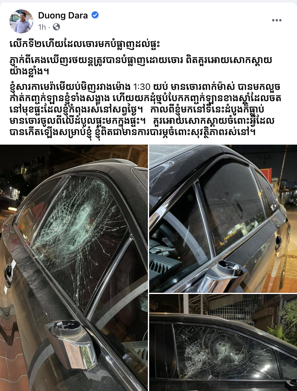 “លេីកទី២ហេីយដែលចោរមកបំផ្លាញដល់ផ្ទះ ភ្ញាក់ពីគេងឃេីញរថយន្តត្រូវបានបំផ្លាញដោយចោរ​ ពិតគួរអោយសោកស្តាយយ៉ាងខ្លាំង។ ខ្ញុំសារកាមេរ៉ា​មេីយប់មិញរវាងម៉ោង​ 1:30 យប់​ មានចោរពាក់ម៉ាស់​ បានមកលួចកាត់កញ្ចក់ឡានខ្ញុំទាំងសង្ខាង​ ហេីយយកដុំថ្មបំបែកកញ្ចក់ឡានខាងស្តាំដែលចតនៅមុខផ្ទះដែលខ្ញុំកំពុងរស់នៅសព្វថ្ងៃ។ កាលពីខ្ញុំមកនៅទីនេះដំបូងក៏ធ្លាប់មានចោរចូលពីលេីដំបូលផ្ទះមកក្នុងផ្ទះ។ គួរអោយសោកស្តាយចំពោះអ្វីដែលបានកេីតឡេីងសម្រាប់ខ្ញុំ​ ខ្ញុំពិតជាមានការបារម្ភចំពោះសុវត្ថិភាពរស់នៅ៕”