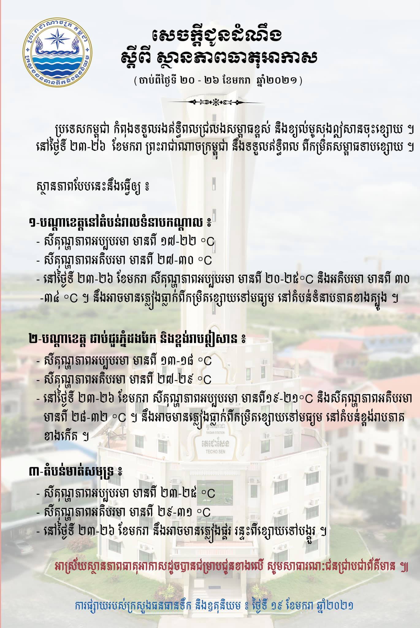 – នៅថ្ងៃទី២៣-២៦ ខែមករា សីតុណ្ហភាពអប្បបរមា មានពី២០-២៥អង្សាសេ និងអតិបរមាមានពី ៣០-៣៤អង្សាសេ។ នឹងអាចមានភ្លៀងធ្លាក់ពីកម្រិតខ្សោយទៅមធ្យម នៅតំបន់ទំនាបភាគខាងត្បូង។