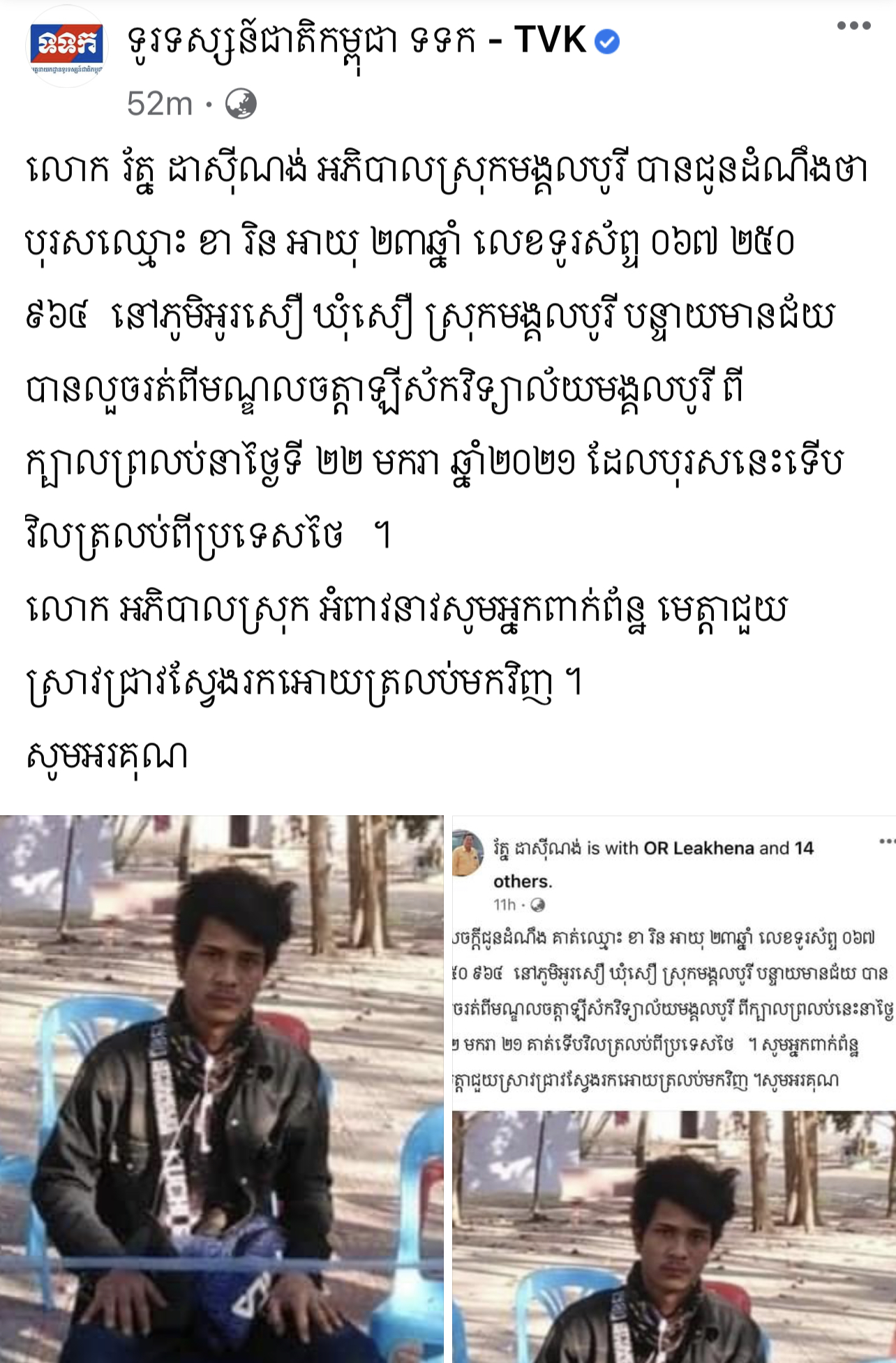 លោក អភិបាលស្រុក ក៏សូមអំពាវនាវសូមអ្នកពាក់ព័ន្ធ មេត្តាជួយស្រាវជ្រាវស្វែងរកអោយត្រលប់មកវិញ សូមអរគុណ ៕