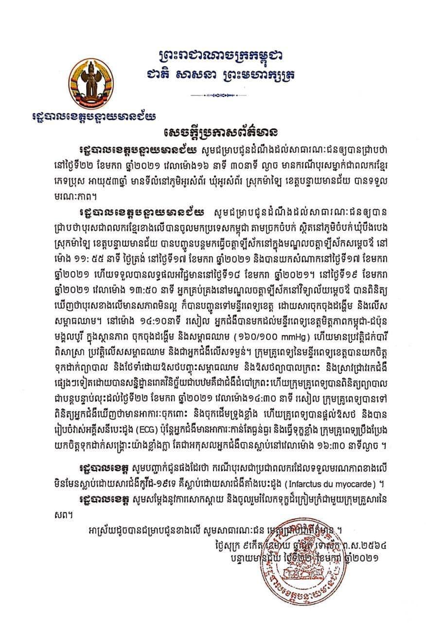 ខេត្តបន្ទាយមានជ័យ៖ ​យោងតាមការចុះផ្សាយរបស់ ទូរទស្សន៍ជាតិកម្ពុជា ទទក – TVK បានឲ្យដឹងថា រដ្ឋបាលខេត្តបន្ទាយមានជ័យ ចេញសេចក្តីប្រកាសព័ត៌មានបានឲ្យដឹងថា នៅថ្ងៃទី២២ ខែមករា ឆ្នាំ២០២១ វេលាម៉ោង១៦ និង៣០នាទីល្ងាច មានករណីបុរសម្នាក់ជាពលករខ្មែរ អាយុ៥៣ឆ្នាំ រស់នៅភូមិអូរសំព័រ ស្រុកម៉ាឡៃ ខេត្តបន្ទាយមានជ័យបានទទួលមរណៈភាព ក្នុងពេលធ្វើចត្តាឡីស័ក។