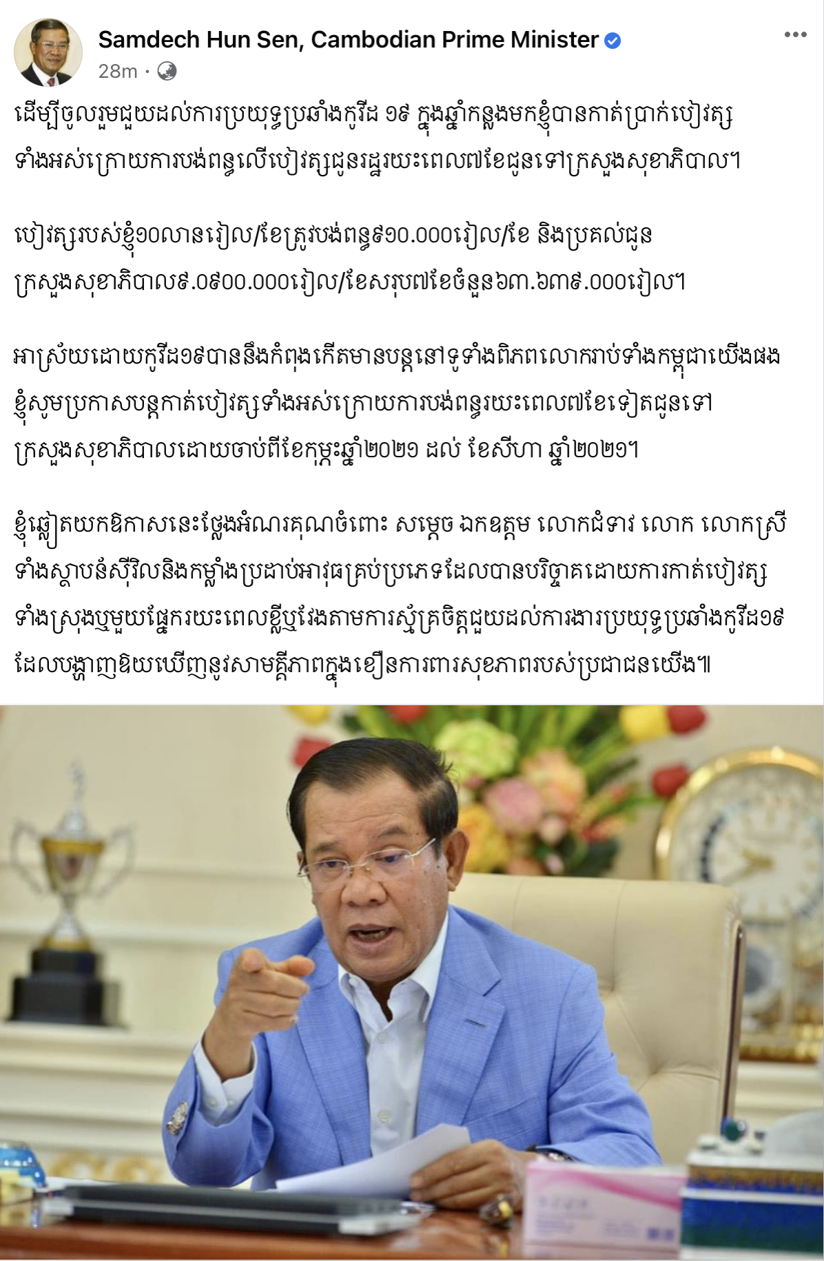 នៅមុននេះបន្តិចសម្តេចតេជោ ហ៊ុន សែន នាយករដ្ឋមន្ត្រីនៃព្រះរាជាណាចក្រកម្ពុជា បានប្រកាសនៅលើ Facebook ផ្លូវការរបស់សម្តេចទាក់ទងទៅនឹងការកាត់ប្រាក់បៀវត្សរបស់សម្តេចទាំងអស់ក្រោយការបង់ពន្ធរួច រយៈពេល៧ខែបន្តទៀត ជូនទៅដល់ក្រសួងសុខាភិបាលដើម្បី ចូលរួមជួយដល់ការប្រយុទ្ធប្រឆាំងកូវីដ-១៩។
