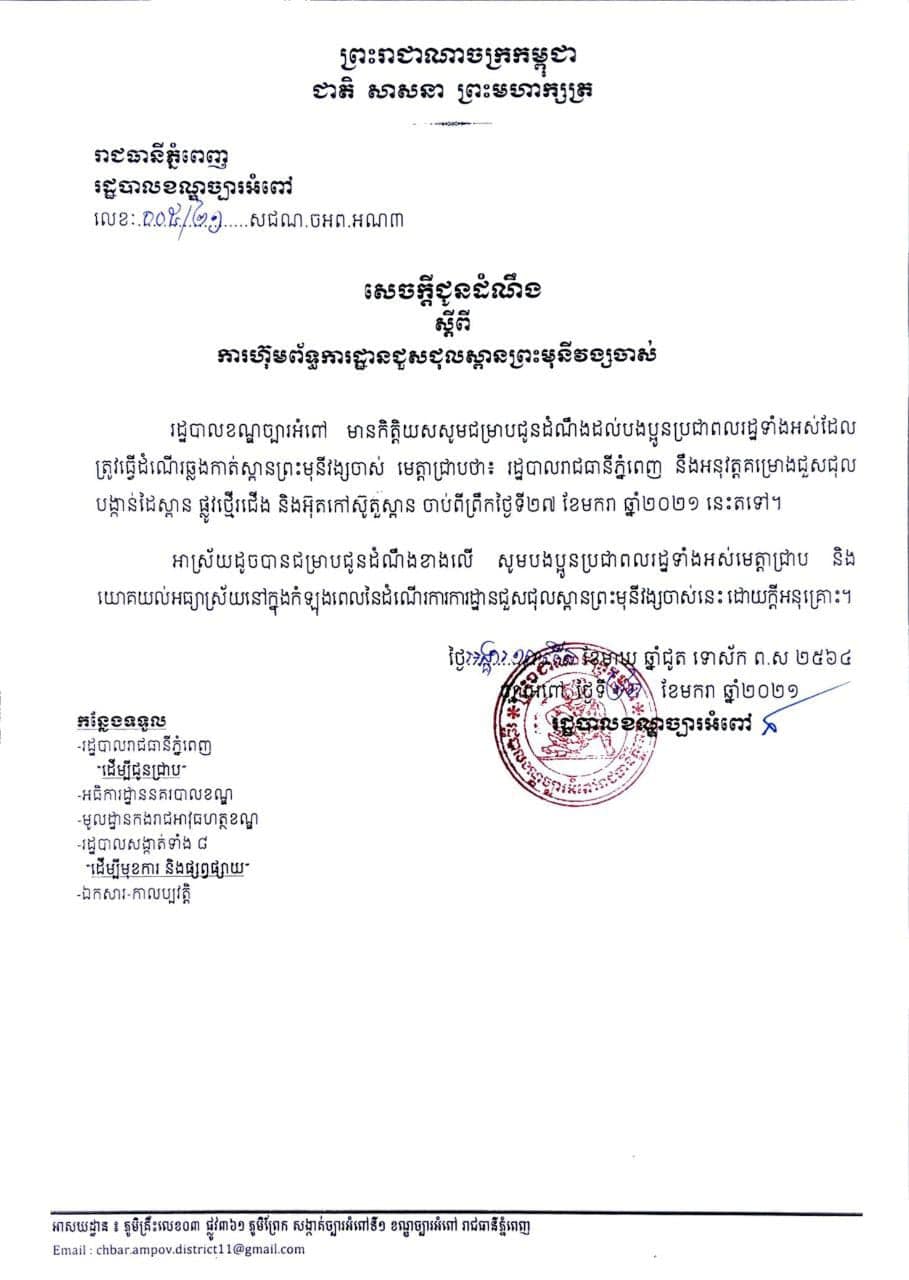 រដ្ឋបាលខណ្ឌច្បារអំពៅ បានចេញសេចក្តី​ជូនដំណឹង សូម​ជម្រាប​ជូនដំណឹង​ដល់​បងប្អូន​ប្រជាពលរដ្ឋ​ទាំងអស់​ដែលត្រូវ​ធ្វើដំណើរ​ឆ្លងកាត់​ស្ពាន​ព្រះមុនីវង្ស​ចាស់ មេត្តា​ជ្រាប​ថា​៖ រដ្ឋបាល​រាជធានី​ភ្នំពេញ នឹង​អនុវត្ត​គម្រោង​ជួសជុល បង្កាន់ដៃស្ពាន ផ្លូវ​ថ្មើរជើង និង​អ៊ុត​កៅស៊ូ​តួ​ស្ពាន ចាប់ពី​ព្រឹក​ថ្ងៃ​ទី​២៧ ខែ​មករា ឆ្នាំ​២០២១ នេះ​តទៅ​។​