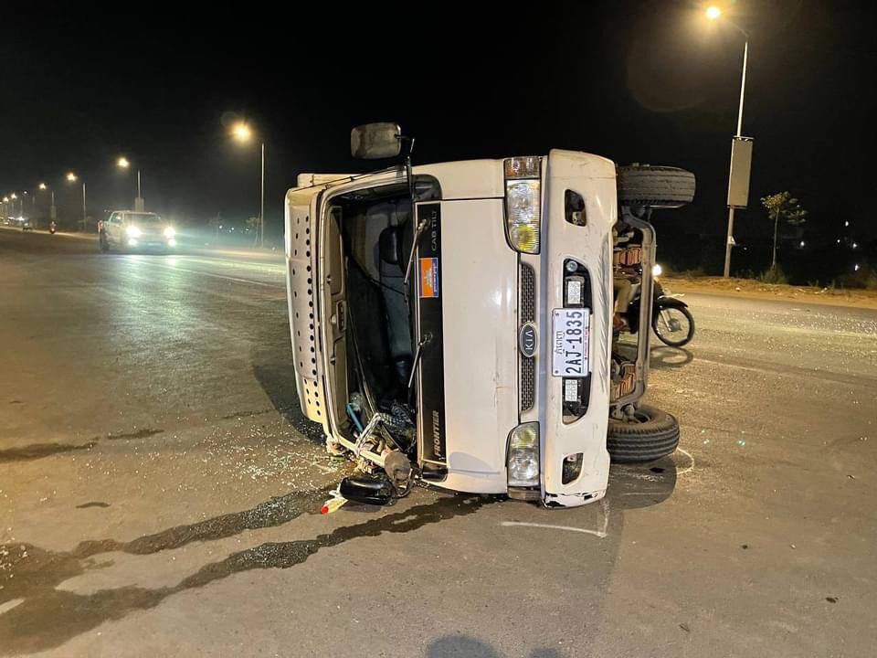 បុរសម្នាក់ទំនងស្រវឹងស្រាបើករថយន្តយីឌុបក្នុងល្បឿនលឿន ជ្រុលទៅបុករថយន្តដឹកទឹកកកពីក្រោយក្រឡាប់ផ្ងារជើង នៅផ្លូវ៦០ម៉ែត្រ