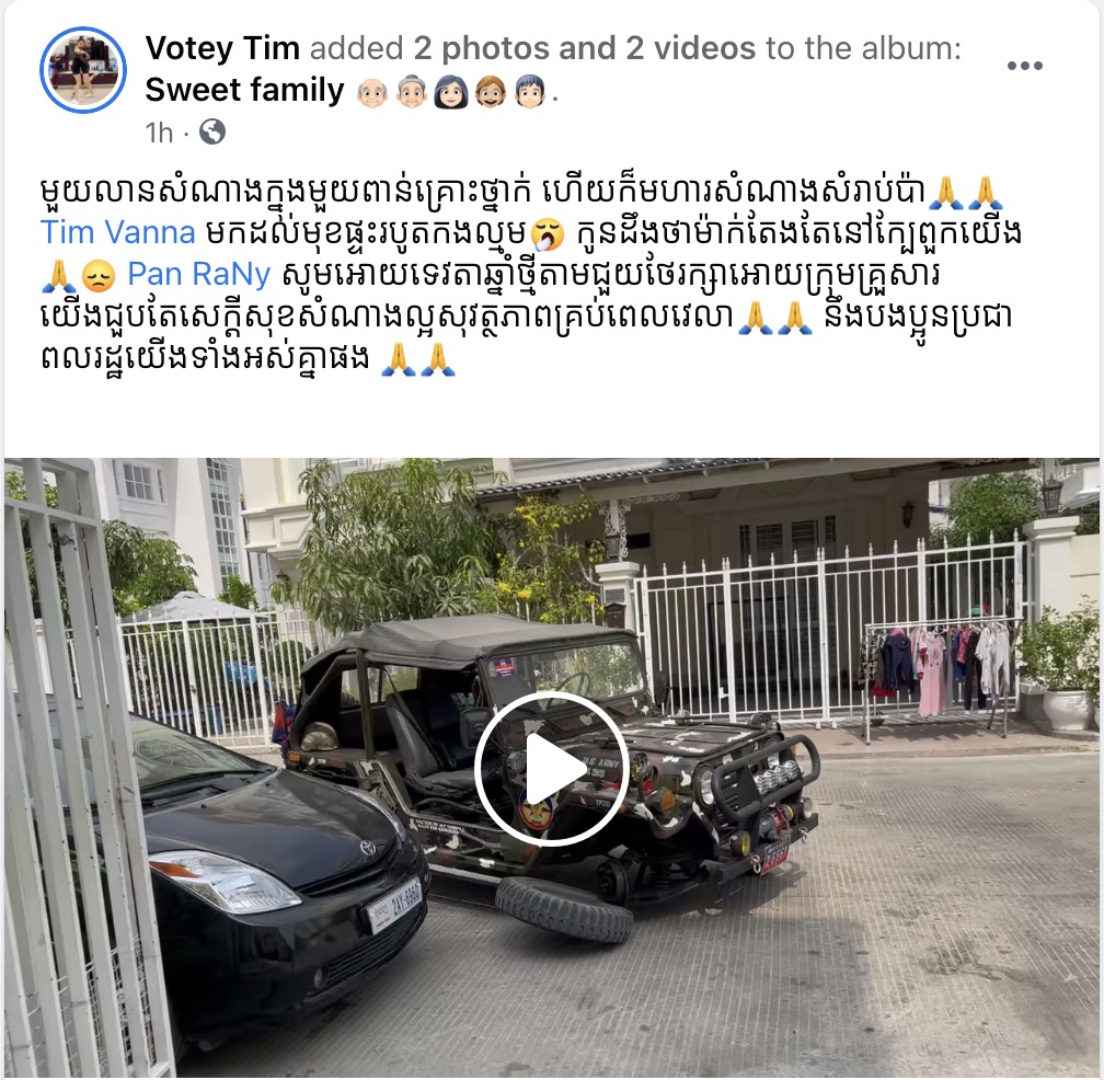យោងតាមការបញ្ជាក់នៅលើគណនីហ្វេសប៊ុករបស់កញ្ញា ទឹម វត្តី បានឲ្យដឹងថា “មួយលានសំណាងក្នុងមួយពាន់គ្រោះថ្នាក់ ហើយក៏មហាសំណាងសំរាប់ប៉ា🙏🙏 Tim Vanna មកដល់មុខផ្ទះរបូតកង់ល្មម🥱 កូនដឹងថាម៉ាក់តែងតែនៅក្បែរពួកយើង 🙏😞 Pan RaNy សូមអោយទេវតាឆ្នាំថ្មីតាមជួយថែរក្សាអោយក្រុមគ្រួសារយើងជួបតែសេក្ដីសុខសំណាងល្អសុវត្ថិភាពគ្រប់ពេលវេលា🙏🙏 និងបងប្អូនប្រជាពលរដ្ឋយើងទាំងអស់គ្នាផង 🙏🙏”។