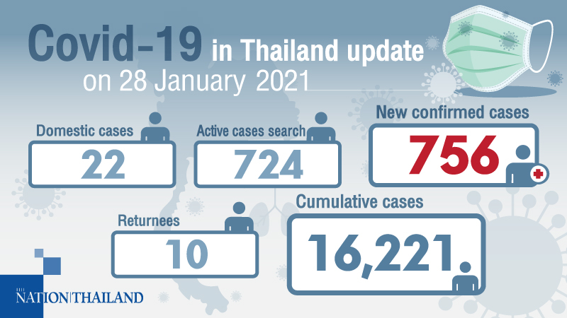 យោងតាមការចុះរបស់សារព័ត៌មាន The Nation Thailand ថ្ងៃព្រហស្បតិ៍ ទី២៨ ខែមករា ឆ្នាំ២០២១ បានរាយការណ៍ថា ប្រទេសថៃមានករណីជំងឺ COVID-19 ថ្មីចំនួន ៧៥៦ ករណី ដោយក្នុងនោះមាន ១០នាក់ ជាករណីនាំចូលពីបរទេស ដែលនាំឱ្យចំនួនសរុប ចាប់តាំងពីប្រទេសនេះមានវត្តមានជំងឺ COVID-19 ជាលើកដំបូង បានកើនដល់ ១៦,២២១ ករណី ។ ពុំមានការស្លាប់ថ្មីបន្ថែមនោះទេនៅថ្ងៃនេះ ដែលនាំឱ្យចំនួនស្លាប់សរុបមាន ៧៦នាក់ ដដែល។