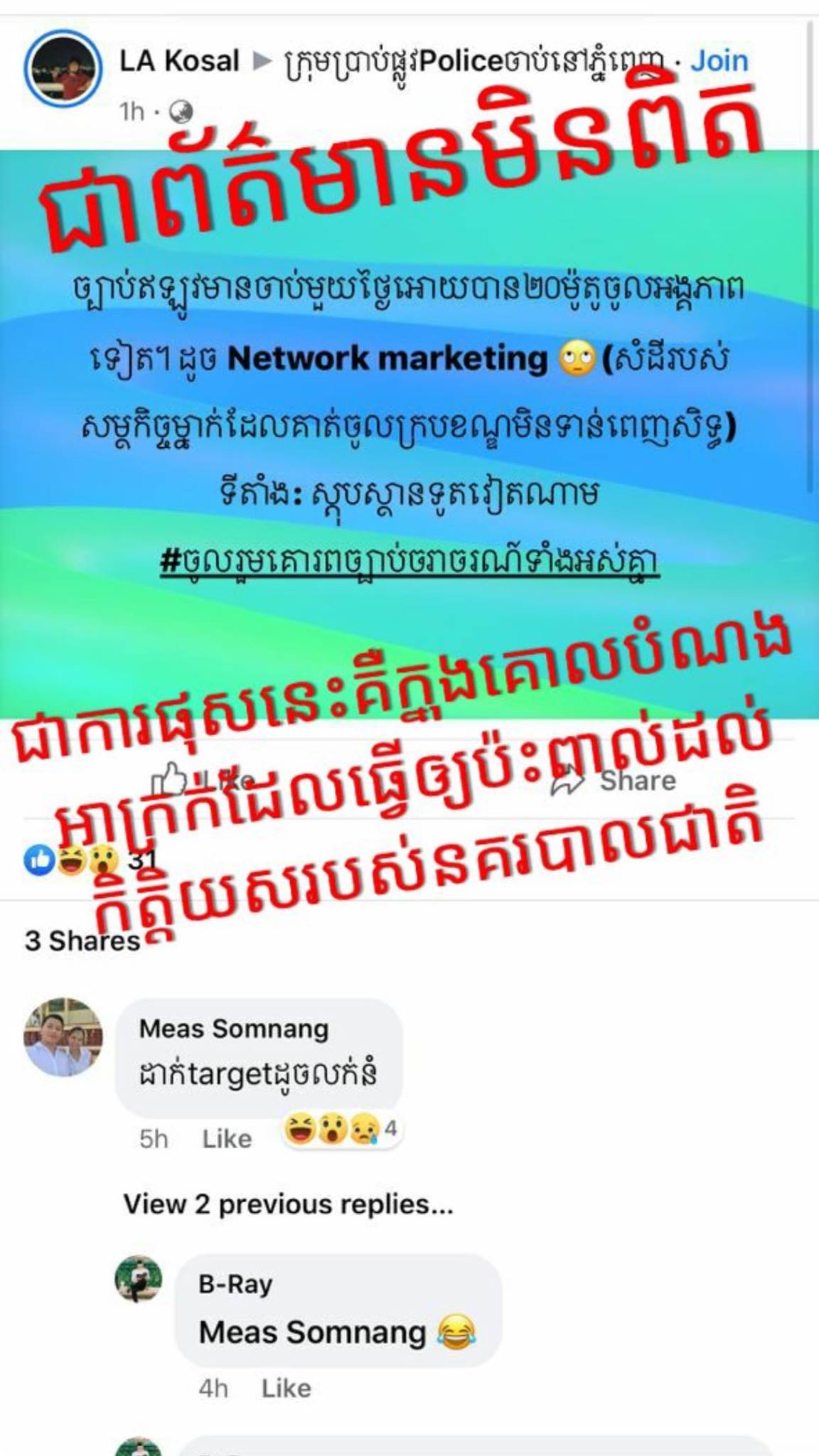 យោងតាមការបញ្ជាក់ពី ស្នងការដ្ឋាននគរបាលរាជធានីភ្នំពេញ បានឲ្យដឹងថា បន្ទាប់ពីបានឃេីញការចុះផ្សាយនៅលើផេកស្នងការដ្ឋាននគរបាលរាជធានីភ្នំពេញ កាលពីថ្ងៃទី២៥ ខែមករា ឆ្នាំ២០២១ ឈ្មោះ ឡា កុសល់ ភេទប្រុស អាយុ២០ឆ្នាំ បានចូលខ្លួនមកទទួលកំហុសរបស់ខ្លួនដែលបានប្រើប្រាស់គណនីហ្វេបុកឈ្មោះ La kosal ធ្វើការបង្ហោះព័ត៌មានមិនពិតមើលងាយដល់សមត្ថកិច្ច ក៏ដូចជាបង្ខូចកិត្តយសមត្ថកិច្ច បន្ទាប់ពីរូបគាត់ត្រូវបានសម្ថកិច្ចធ្វេីការផាកពិន័យ ដោយគាត់បានបើកបរល្មើសច្បាប់ចរាចរណ៍ កាលពីថ្ងៃទី ២៥ ខែមករា ឆ្នាំ២០២១ នៅត្រង់ចំណុចស្តុបស្ថានទូតវៀតណាម ពីបទល្មើសភ្លើងសញ្ញាចរាចរណ៍ដោយសារតែការខឹង និងខ្វះការពិចារណាមួយពេល ក៏បានបង្ហោះសារជាអក្សរក្នុង ហ្វេសបុក នូវព័ត៌មានមិនពិត កាលពីថ្ងៃទី២៥ ខែមករា ឆ្នាំ២០២១ ដែលមានខ្លឹមសារធ្វើឲ្យប៉ះពាល់ដល់កិត្តិយស សេចក្តីថ្លៃថ្នូ របស់នគរបាលជាតិ។