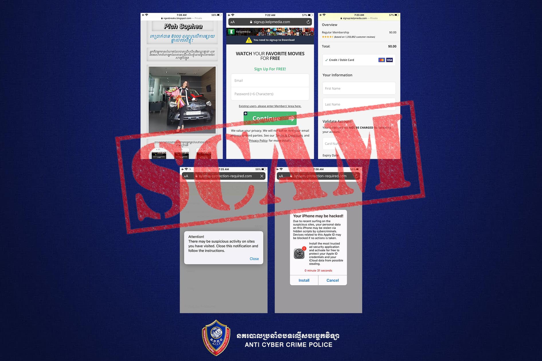នៅក្នុងការបោកបញ្ឆោតនេះ ជាដំបូងជនខិលខូចបានប្រើពាក្យពេចន៍ថា លោកអ្នកអាចនឹងរកប្រាក់បាន ៥០០០ដុល្លារ តាមរយៈការផ្សព្វផ្សាយនេះ ប៉ុន្តែនៅពេលដែលលោកអ្នកចុចបន្ត វានឹងស្នើសុំឱ្យបញ្ចូល អ៊ីម៉ែល លេខសម្ងាត់ ដើម្បីបង្កើតគណនីមើលវីដេអូ និងបញ្ចូលលេខប័ណ្ណឥណទានដើម្បីបញ្ជាក់អត្តសញ្ញាណ។ បន្ទាប់ពីបានលេខប័ណ្ណឥណទានហើយជនខិលខូចបានប្រើពាក្យពេជន៍បន្ថែមដោយអះអាងថា ទូរសព្ទរបស់លោកអ្នកត្រូវបានវាយប្រហារ គណនីនិងទិន្នន័យនៅក្នុង iCloud អាចត្រូវបានលួច និងទូរសព្ទអាចត្រូវឈប់ដំណើរការ ដើម្បីឱ្យលោកអ្នកបញ្ចូលកម្មវិធីបន្ថែម។