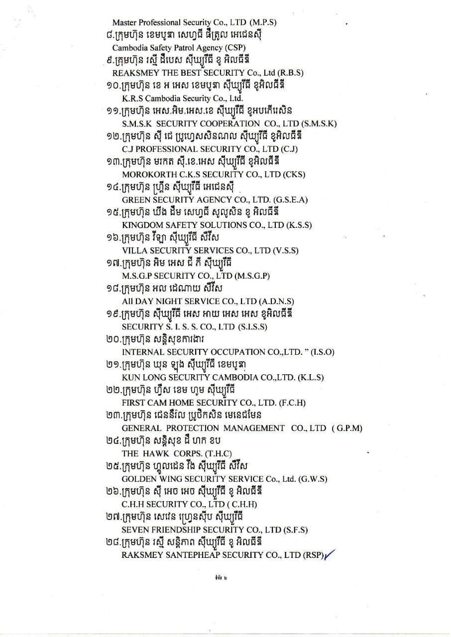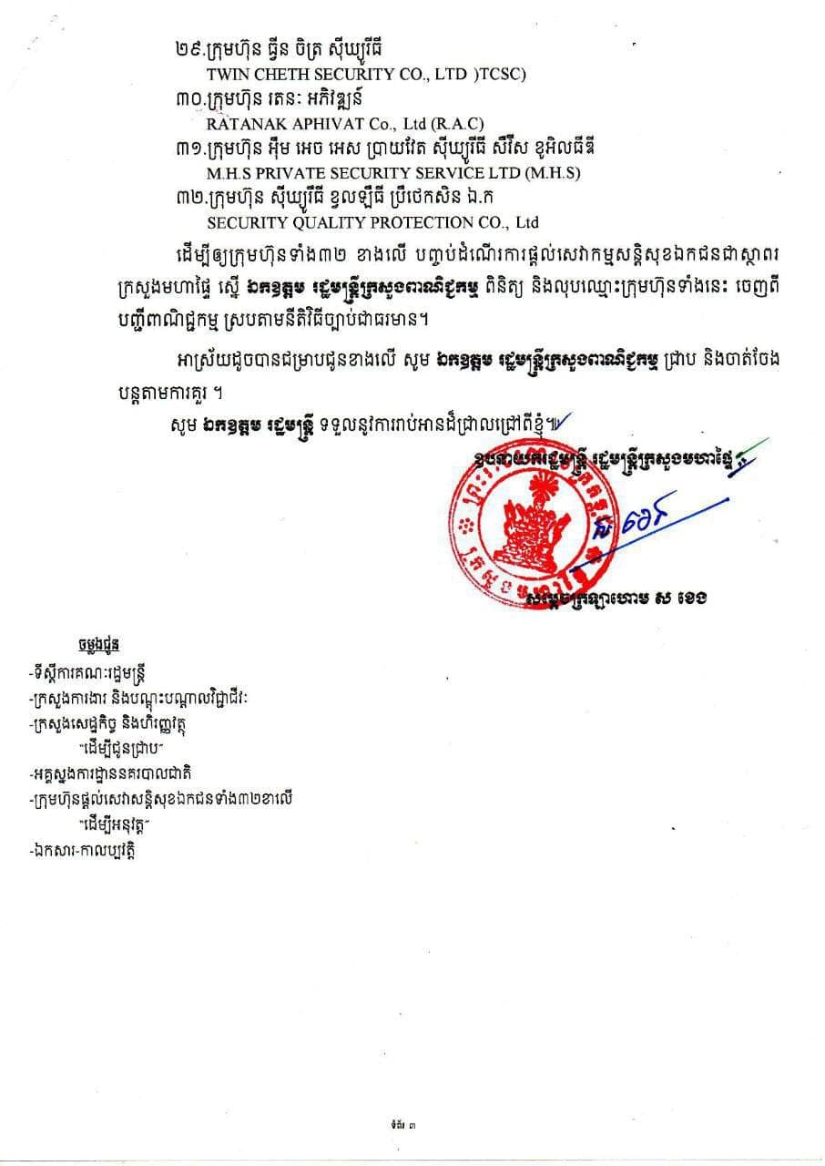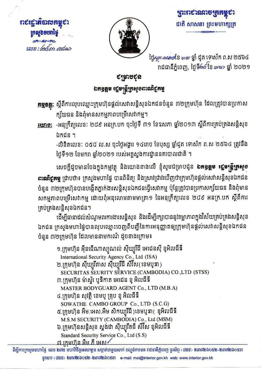 ដើម្បីធានាដល់សំណូមពរការងារសន្តិសុខ និងដើម្បីរក្សាបាននូវតម្លាភាពក្នុងវិស័យគ្រប់គ្រងសន្តិសុខឯកជន ក្រសួងមហាផ្ទៃបានលុបឈ្មោះចេញពីបញ្ជីនៃការអនុញ្ញាតឲ្យក្រុមហ៊ុនផ្ដល់សេវាសន្តិសុខឯកជនចំនួន៣២ ក្រុមហ៊ុន ដែលមាននាមករណ៍ ដូចខាងក្រោម៖