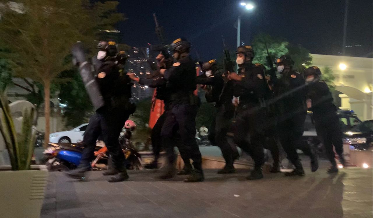 ភ្លាមៗនោះស្រាប់តែឃើញមានកម្លាំងកងកម្លាំងសមត្ថកិច្ចជាច្រើន បានចុះមកដល់កន្លែងកើតហេតុបន្តបន្ទាប់គ្នា ដោយកម្លាំងមូលដ្ឋានកងរាជអាវុធហត្ថខណ្ឌចំការមន ដែលចុះទៅអន្តរាគមន៍ដល់កន្លែងកើតហេតុមុនគេ បន្តិចក្រោយកម្លាំងការិយាល័យព្រហ្មទណ្ឌកម្រិតធ្ងន់ នៃនាយកដ្ឋាននគរបាលព្រហ្មទណ្ឌ ក្រសួងមហាផ្ទៃ ក៏បានដល់ដែរ និងកម្លាំងចម្រុះអធិការដ្ឋាននគរបាលខណ្ឌចំការមន និងប៉ុស្តិ៍ទន្លេបាសាក់ បានចុះមកដល់ជាបន្តបន្ទាប់។ ភ្លាមៗនោះ កម្លាំងមូលដ្ឋានអាវុធហត្ថខណ្ឌចំការមន បានធ្វើការបង្ក្រាបជាជំហានដំបូង ដោយឃាត់ខ្លួនបានបុរសចំនួន៦នាក់ យកទៅសាកសួរនៅ មូលដ្ឋានអាវុធហត្ថខណ្ឌចំការមនសិនផងដែរ។