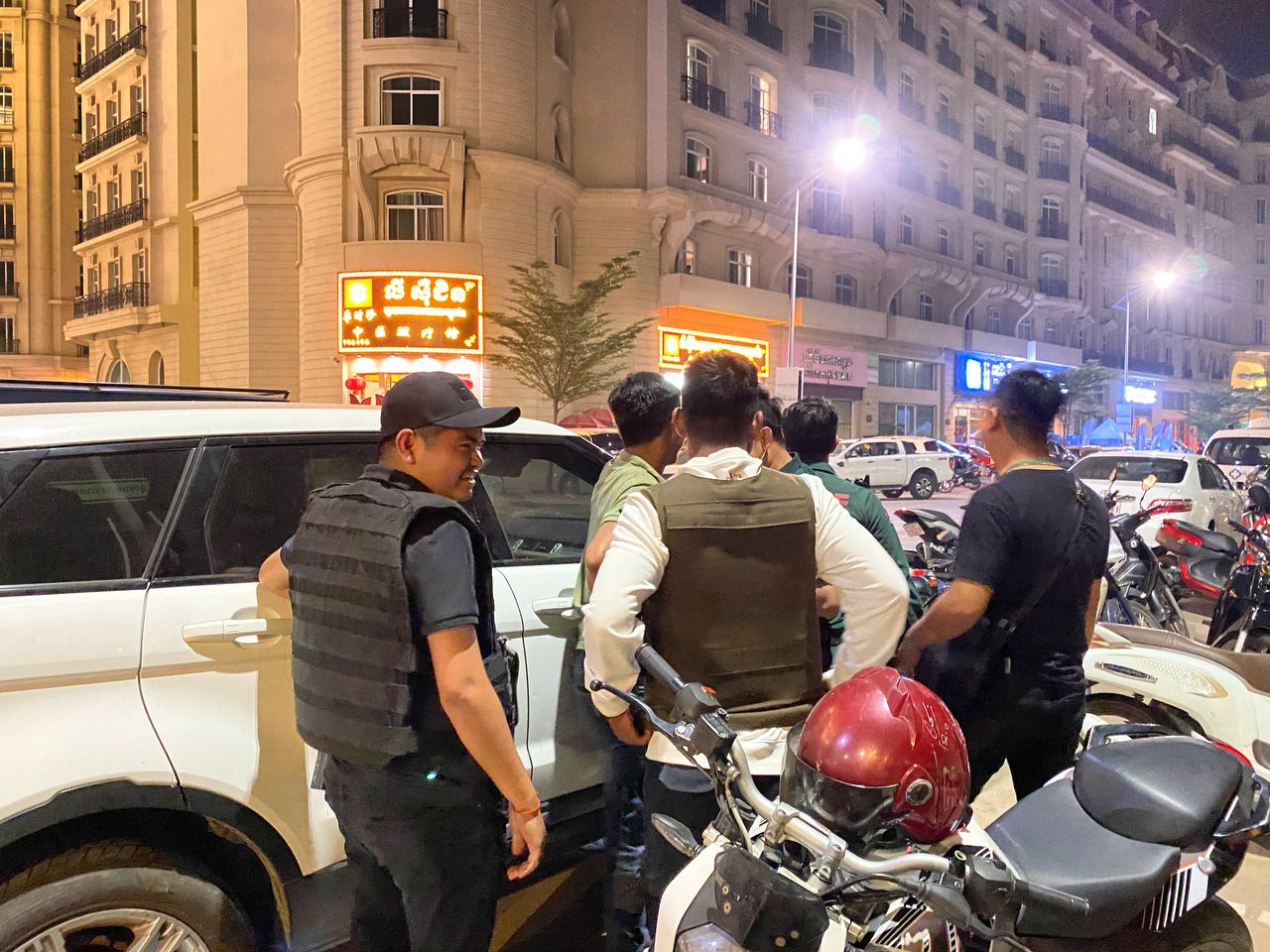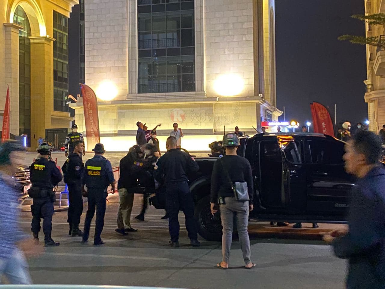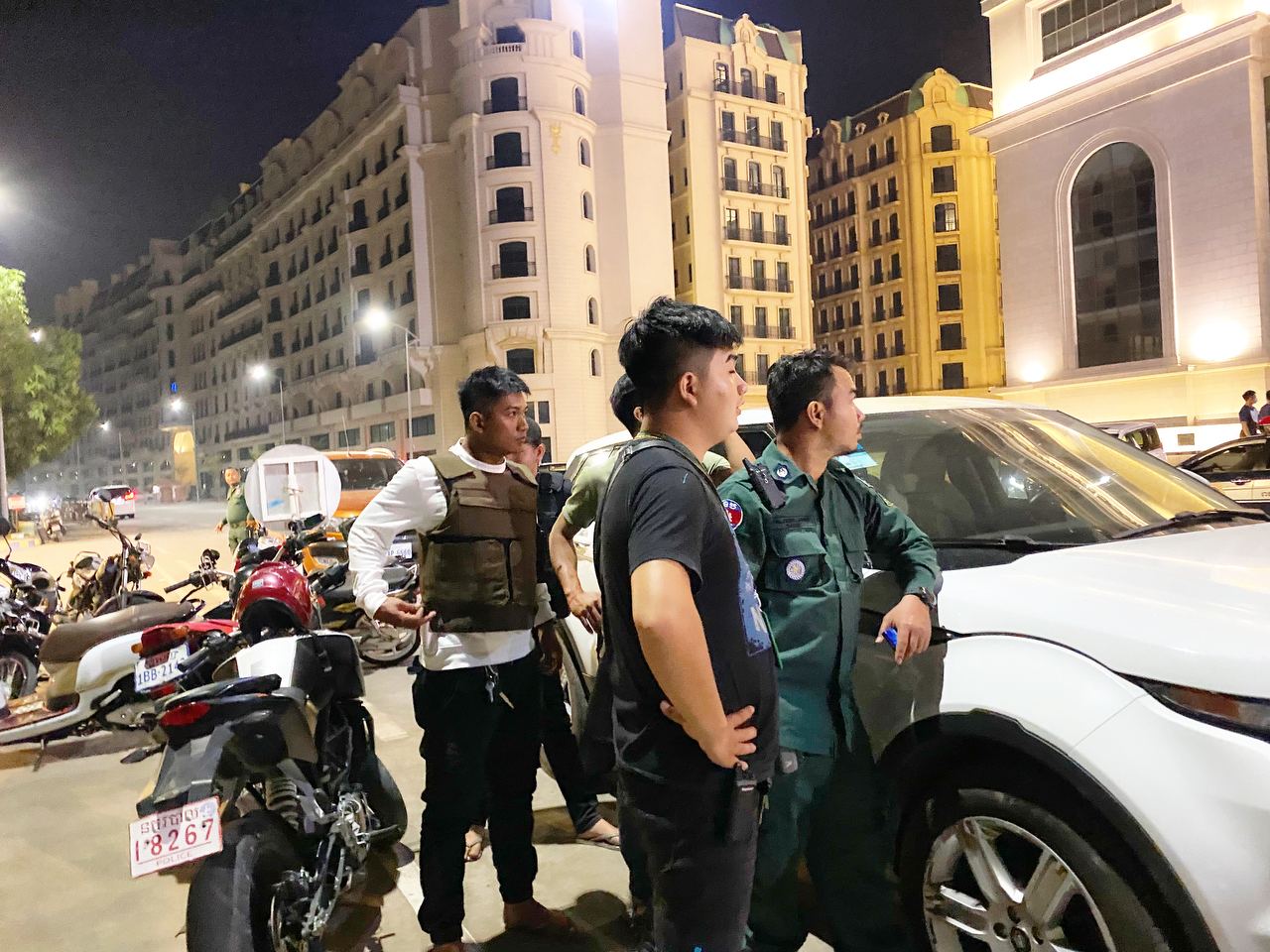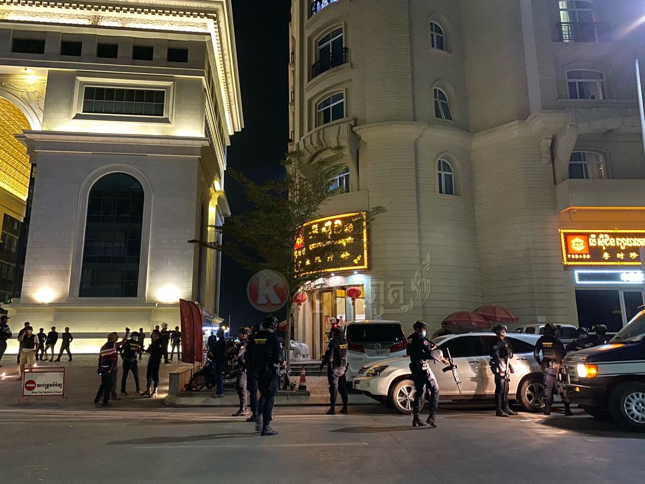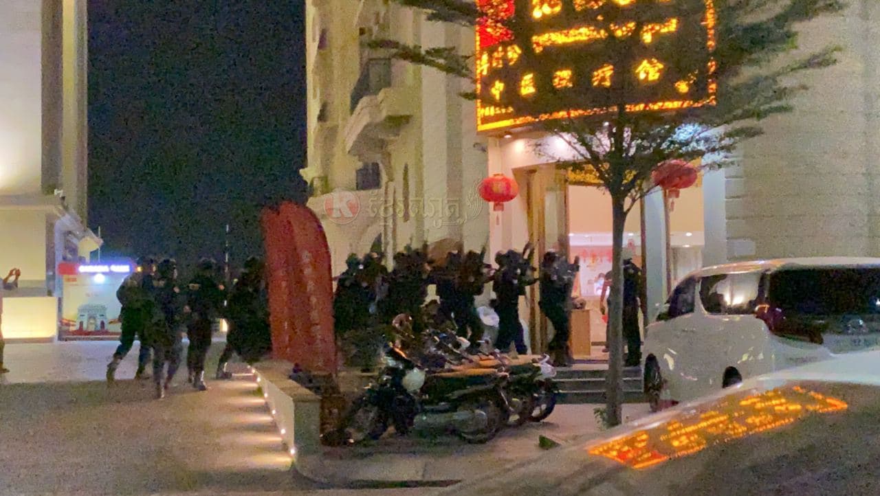 ហេតុការណ៍នេះគេឃើញមានជនជាតិចិន២នាក់ បានរងរបួសដោយមិនទាន់ដឹងពីមូលហេតុ នៅត្រូវបានបញ្ជូនតាមរថយន្តសង្គ្រោះរបស់ អាវុធហត្ថរាជធានីភ្នំពេញ ដឹកយកទៅសង្គ្រោះនៅឯមន្ទីរពេទ្យ។ ក្រោយមកគេឃើញក្បួនកម្លាំង គ-អន្តរាគមន៍ នៃកងរាជអាវុធហត្ថរាជធានីភ្នំពេញ ចុះមកដល់កន្លែងកើតហេតុរងចាំបទបញ្ជា ត្រៀមលក្ខណៈ ចុះប្រតិបត្តិការ ទ្រុងទ្រាយធំ ដែលធ្វើឡើងបន្ទាប់ពីសមត្ថកិច្ចទទួលបានព័ត៌មានថា ក្រុមជនសង្ស័យទាំងនេះប្រដាប់ដោយអាវុធនៅជាន់ខាងលើ ទើបកម្លាំងជំនាញ និងកម្លាំង គ-អន្តរាគមន៍ នៃកងរាជអាវុធហត្ថរាជធានីភ្នំពេញ ដឹកនាំផ្ទាល់ដោយលោកឧត្តមសេនីយ៍ឯក រ័ត្ន ស្រ៊ាង មេបញ្ជាការរងកងរាជអាវុធហត្ថលើផ្ទៃប្រទេស និងជាមេបញ្ជាការកងរាជអាវុធហត្ថរាជធានីភ្នំពេញ សហការណ៍ជាមួយកម្លាំងមូលដ្ឋានអាវុធហត្ថខណ្ឌចំការមន បានបន្តប្រតិបត្តិការទ្រុងទ្រាយធំតែម្ដង ដោយកម្លាំង គ-អន្តរាគមន៍ នៃកងរាជអាវុធហត្ថរាជធានីភ្នំពេញ បានឆ្មក់ចូលបង្ក្រាប និងធ្វេីការតាមជំនាញរបស់ អាវុធហត្ថផងដែរ។