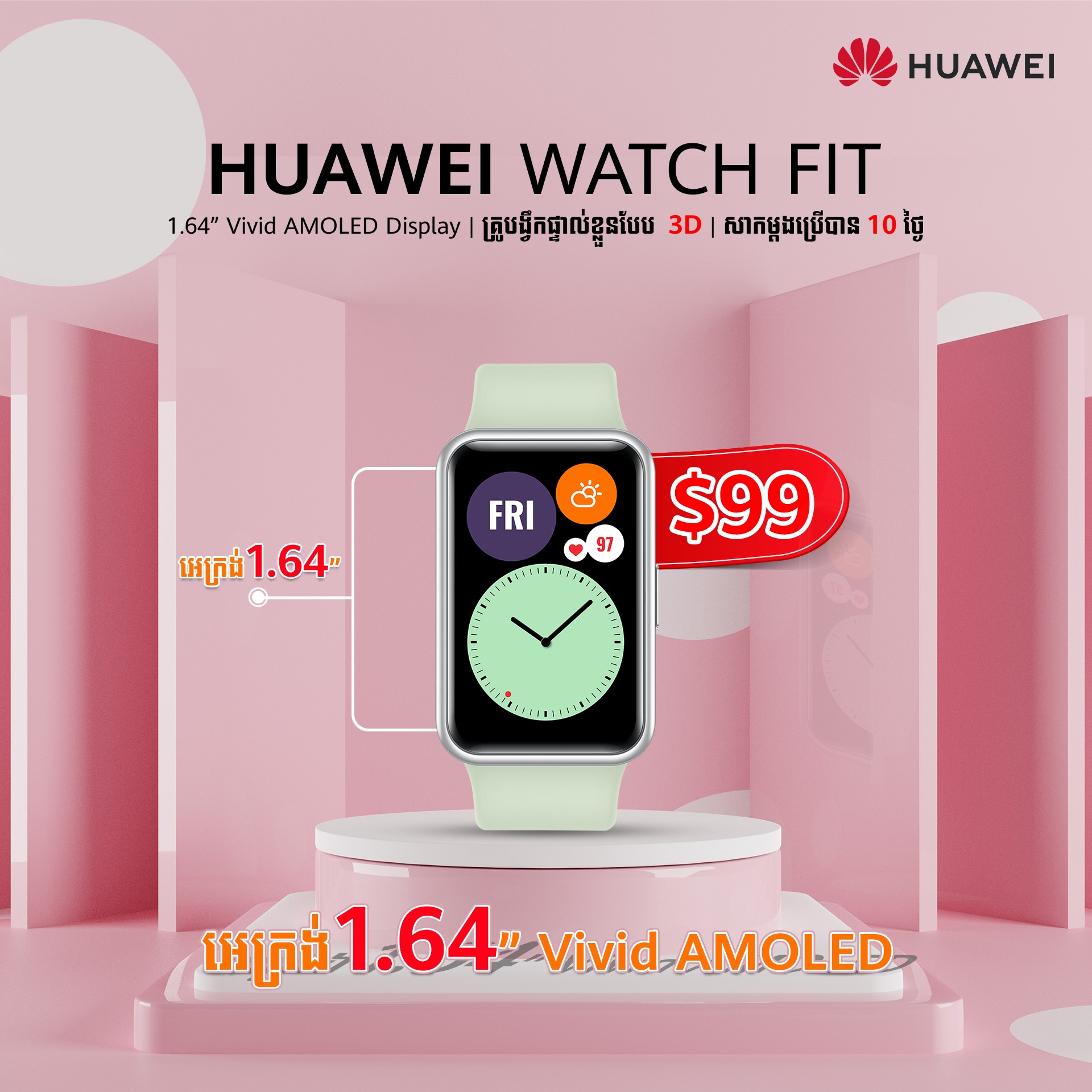 Huawei Watch Fit ត្រូវបានរចនាឡើងច្រើនជម្រើសពណ៌សម្រាប់ជ្រើសរើស និងមានរូបរាងស្តើងស្រាល ភ្ជាប់មុខងារគ្រូបង្វឹកហាត់ប្រាណផ្ទាល់ខ្លួនបែប 3D សាកម្តង ប្រើបាន10ថ្ងៃ។ HUAWEI WATCH FIT មិនត្រឹមតែជាគ្រឿងលម្អទាន់សម័យប៉ុណ្ណោះទេ ថែមទាំងជាជំនួយការផ្តល់ព័ត៌មានសុខភាពប្រចាំថ្ងៃរបស់អ្នកប្រើប្រាស់ ដូចជា មុខងារ វាស់កម្រិតអ៊ុកស៊ីសែនក្នុងឈាម (SpO2 monitoring), មុខងារវាស់សម្ពាធស្ត្រេស (Huawei TruRelax), មុខងារតាមដានតំណេក (Huawei TruSleep 2.0) និង មុខងារវាស់ចង្វាក់បេះដូង (Huawei TruSeen 4.0)។