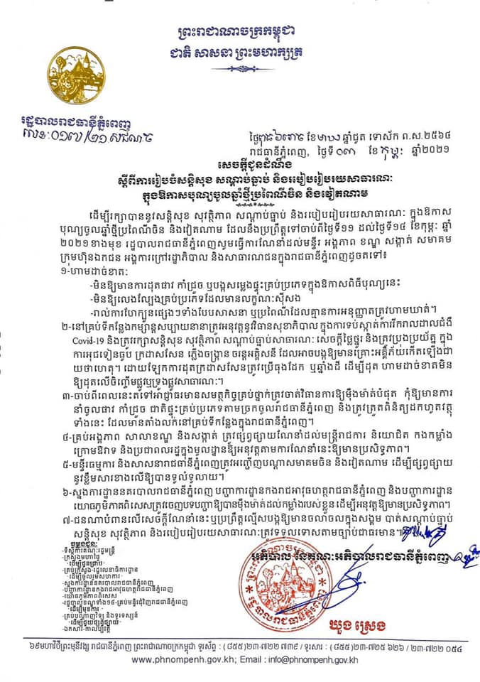 នៅរសៀលថ្ងៃទី៣ ខែកុម្ភៈ ឆ្នាំ២០២១ រដ្ឋបាលរាជធានីភ្នំពេញបានចេញសេចក្តីជូនដំណឹងមួយស្តីពីការរៀបចំសន្តិសុខ សណ្តាប់ធ្នាប់ និងរបៀបរៀបរយសាធារណៈ ក្នុងឱការបុណ្យចូលឆ្នាំថ្មីប្រពៃណីចិន និង វៀតណាម ដោយធ្វើការហាមឃាត់មិនអោយដុតផាវ កាំជ្រួច ឬបង្កសំលេងផ្ទុះគ្រប់ប្រភេទ និងមិនអោយលេងល្បែងគ្រប់ប្រភេទដែលមានលក្ខណៈស៊ីសង មិនអោយហែរក្បួនផ្សេងៗទាំងបែបសាសនា ឬប្រពៃណីដោយគ្មានការអនុញ្ញាត។
