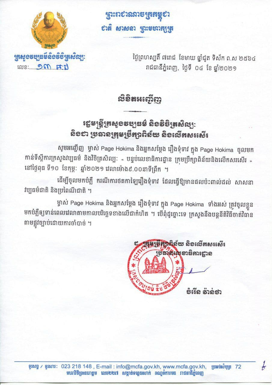 នារសៀលថ្ងៃទី០៤ ខែកុម្ភៈ ឆ្នាំ២០២១ នេះ ក្រសួងវប្បធម៌ និងវិចិត្រសិល្បៈ បានចេញលិខិតអញ្ជើញម្ចាស់ Page Hokima និងអ្នកសម្តែង រឿងទុំទាវ ក្នុង Page Hokima ចូលមកបំភ្លឺ ករណីការថតកាឡៃរឿងទុំទាវ ដែលធ្វើឲ្យមានការប៉ះពាល់ដល់សាសនា វប្បធម៌ និងប្រពៃណីជាតិ។ តាមរយៈលិខិតអញ្ជើញនោះក៏បានបញ្ជាក់ដែរថា ម្ចាស់ Page Hokima និងអ្នកសម្តែង រឿងទុំទាវ ក្នុង Page Hokima ទាំងអស់ ត្រូវចូលខ្លួនមកបំភ្លឺឲ្យទាន់ពេលវេលាតាមកាលបរិច្ឆេទជាកំហិត បើពុំដូច្នោះទេ ក្រសួងនឹងបន្តនីតិវិធីចាត់វិធានការតាមផ្លូវច្បាប់ដោយការចាំបាច់៕