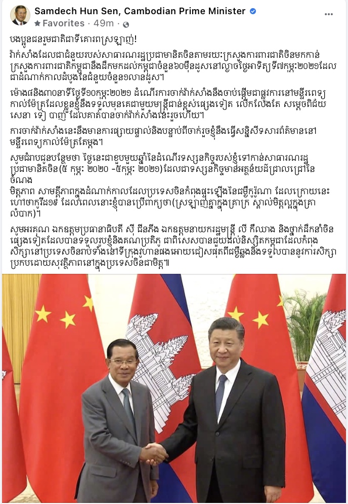 នៅមុននេះបន្តិចសម្តេចតេជោ ហ៊ុន សែន នាយករដ្ឋមន្ត្រីនៃព្រះរាជាណាចក្រកម្ពុជា បានថ្លែងនៅក្នុងសារមួយនៅលើទំព័រ Facebook ផ្លូវការថា វ៉ាក់សាំងកូវីដ-១៩ នឹងមកដល់កម្ពុជានៅល្ងាចថ្ងៃអាទិត្យថ្ងៃទី៧ ខែកុម្ភៈ ឆ្នាំ២០២១ នេះដោយក្នុងនោះវ៉ាក់សាំងចំនួន៦០ម៉ឺនដូស នឹងមកដល់មុនគេដែលវាជាដំណាក់កាលដំបូងនៃជំនួយចំនួន១លាដូស របស់សាធារណរដ្ឋប្រជាមានិតចិន។