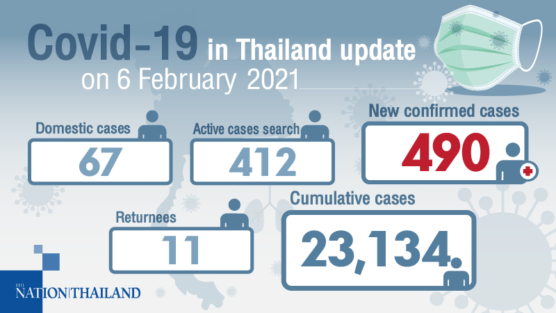 យោងតាមការចុះផ្សាយរបស់សារព័ត៌មាន The Nation Thailand នៅថ្ងៃសៅរ៍ ទី០៦ ខែកុម្ភៈ ឆ្នាំ២០២១ បានឱ្យដឹងថា មជ្ឈមណ្ឌលរដ្ឋបាលសម្រាប់ស្ថានភាពជំងឺ COVID-19 (CCSA) បានរាយការណ៍ពីករណីថ្មីនៃជំងឺ COVID-19 ចំនួន ៤៩០ ករណី ដោយក្នុងនោះមាន ១០ ករណី ជាការនាំចូលពីបរទេស និងត្រូវបានគេដាក់ឱ្យសម្រាកនៅដាច់ដោយឡែក។ ក្នុងចំណោមករណីនាំចូលទាំងអស់ ក៏មានម្នាក់ជាជនជាតិខ្មែរផងដែរ ដែលគាត់បានឆ្លងដែនពីប្រទេសម៉ាឡេស៊ី។