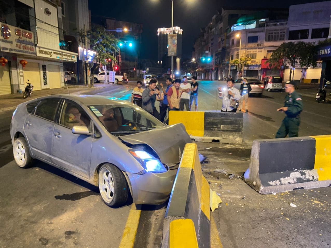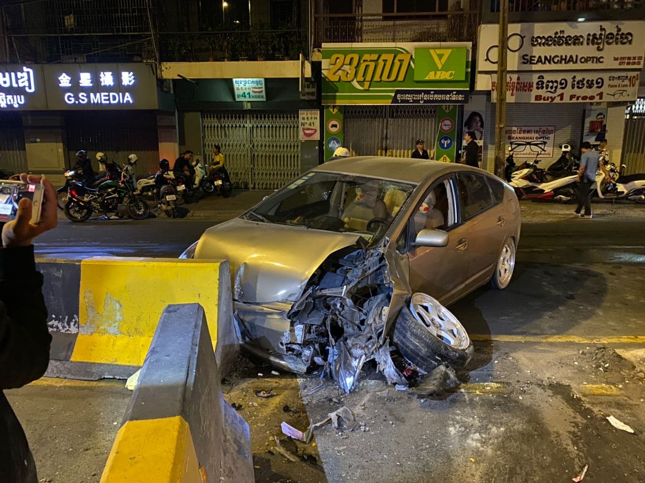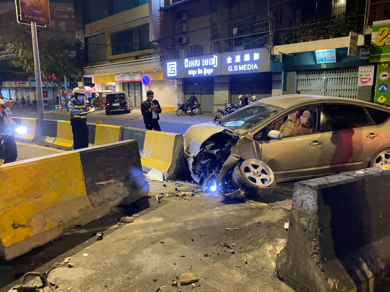 រាជធានីភ្នំពេញ៖ ស្ដែងៗណាស់! បុរសស្រីមួយក្រុមបើករថយន្ត PRUIS លឿនពេក រេចង្កូតទៅបុករបាំងថ្មពុះចែកទ្រូងផ្លូវពេញទំហឹង បណ្ដាលឲ្យរបាំងថ្ម២ដុំខ្ទាតទៅលើគន្លងផ្លូវម្ខាងទៀត ហើយអ្នកបើកបរនិងអ្នករួមដំណើរបាន នាំគ្នាគេចចេញទៅបាត់អស់ បន្សល់តែរថយន្ត បាក់កាឡេកង់មុខ បើកទៅមុខលែងរួចទទឹងផ្លូវប៉ុណ្ណោះ។ ហេតុការណ៍គ្រោះថ្នាក់ចរាចរណ៍នេះកើតឡើងកាលពីវេលាម៉ោង០៣៖២០នាទីទាបភ្លឺ ឈានចូលថ្ងៃចន្ទ ទី០៨ ខែកុម្ភៈ ឆ្នាំ២០២១នេះ នៅត្រង់ចំណុចខាងលិចស្តុបអូតែលស ចម្ងាយ៥០ម៉ែត្រ លើវិថីហ្សាលដឺហ្គោល (ផ្លូវលេខ២១៧) ស្ថិតក្នុងសង្កាត់មនោរម្យ ខណ្ឌ៧មករា រាជធានីភ្នំពេញ។