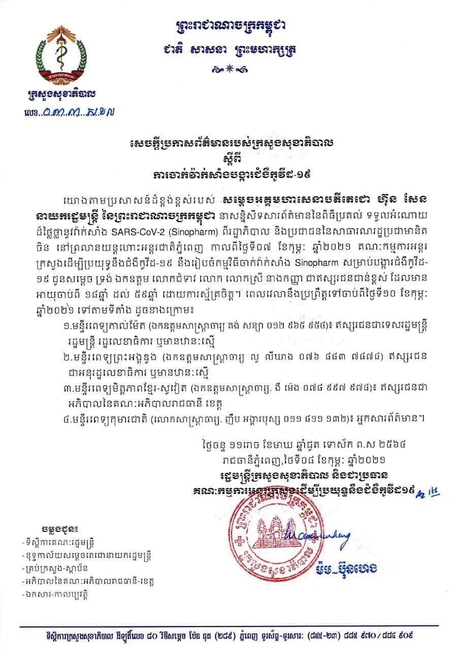 ដោយយោងតាមប្រសាសន៍ដ៏ខ្ពង់ខ្ពស់របស់ សម្តេចអគ្គមហាសេនាបតីតេជោ ហ៊ុន សែន នាយករដ្ឋមន្រ្តី នៃព្រះរាជាណាចក្រកម្ពុជា នាសន្និសីទសារព័ត៌មាននៃពិធីប្រគល់ ទទួលអំណោយ ដ៏ថ្លៃថ្លានូវវ៉ាក់សាំង SARS-CoV-2(Sinopharm) ពីរដ្ឋាភិបាល និងប្រជាជននៃសាធារណរដ្ឋប្រជាមានិតចិន នៅព្រលានយន្តហោះអន្តរជាតិភ្នំពេញ កាលពីថ្ងៃទី៧ ខែកុម្ភៈ ឆ្នាំ២០២១ គណៈកម្មការអន្តរក្រសួង ដើម្បីប្រយុទ្ធនឹងជំងឺកូវីដ១៩ នឹងរៀបចំកម្មវិធីចាក់វ៉ាក់សាំង Sinopharm សម្រាប់បង្ការជំងឺកូវីដ-១៩ ជូនសម្តេចទ្រង់ ឯកឧត្តម លោកជំទាវ លោក លោកស្រី អ្នកនាងកញ្ញា ជាឥស្សរជនជាន់ខ្ពស់ ដែលមានអាយុចាប់ពី១៨ឆ្នាំ ដល់៥៩ឆ្នាំ ដោយការស្ម័គ្រចិត្ត។ ពេលវេលានឹងប្រព្រឹត្តទៅចាប់ពីថ្ងៃទី១០ ខែកុម្ភៈ ឆ្នាំ២០២១ ទៅតាមទីតាំង ដូចខាងក្រោម៖